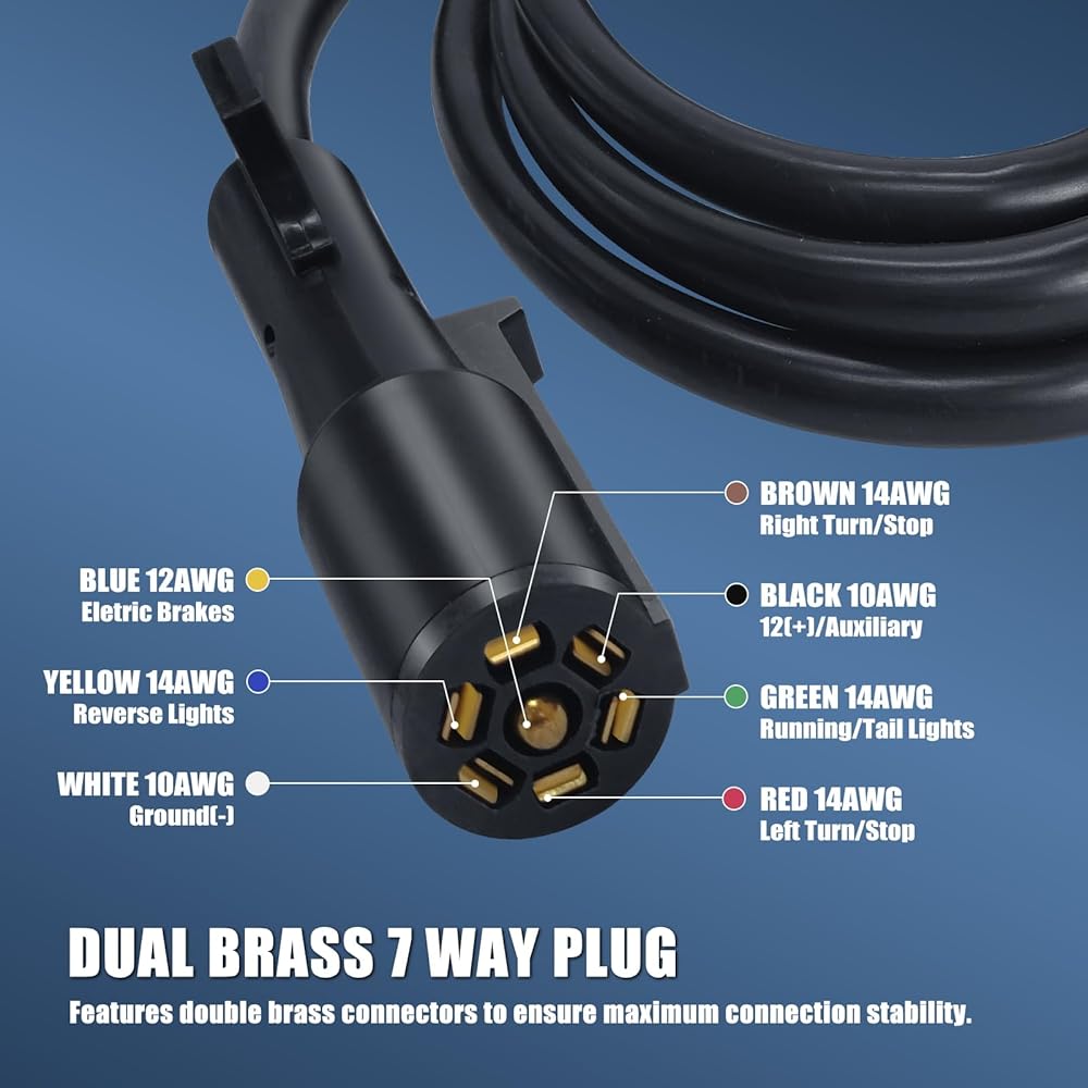 توافق عالمي - يعمل كابل تمديد قابس المقطورة ذو 7 اتجاهات مع جميع أنواع المركبات، بما في ذلك المقطورات والمركبات الترفيهية والسيارات والقوارب وما إلى ذلك. وهو يدعم التحكم في الفرامل والضوء، والأضواء العكسية، وإشارات الانعطاف، والمزيد.