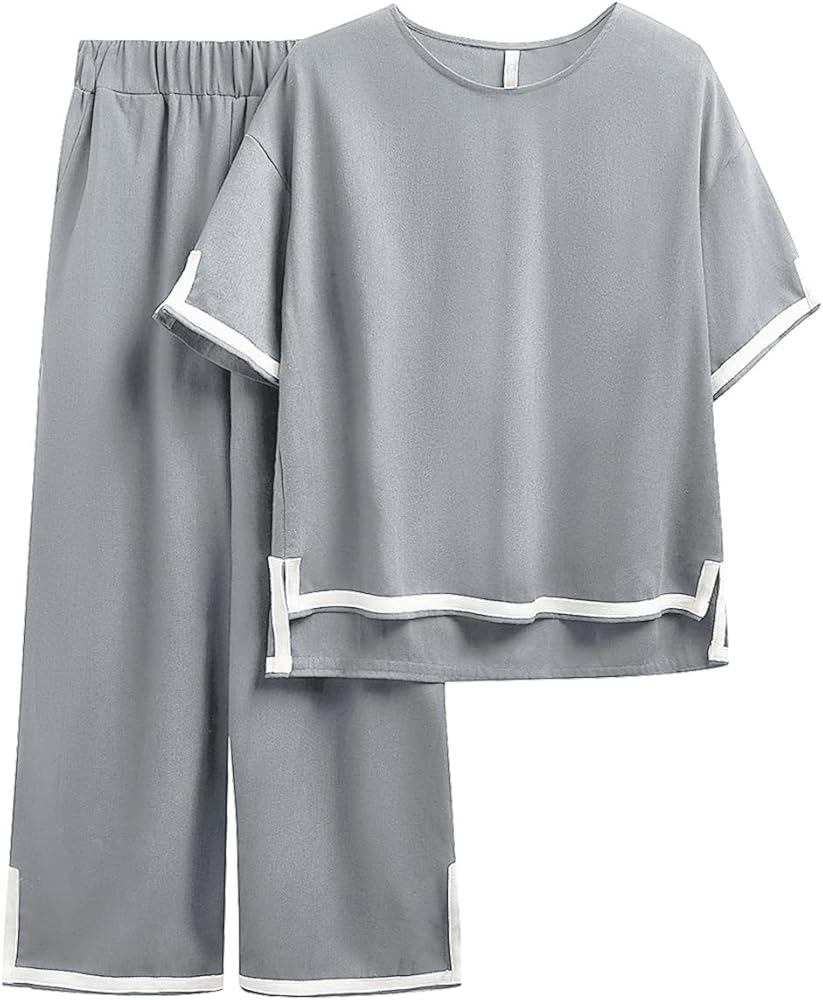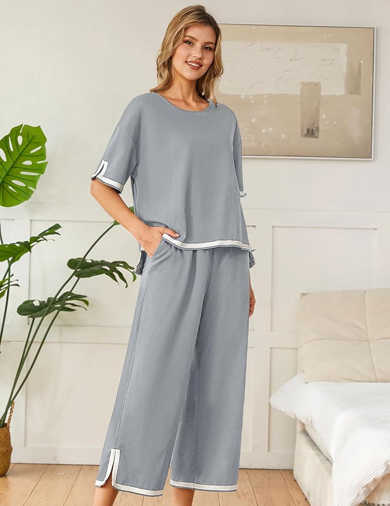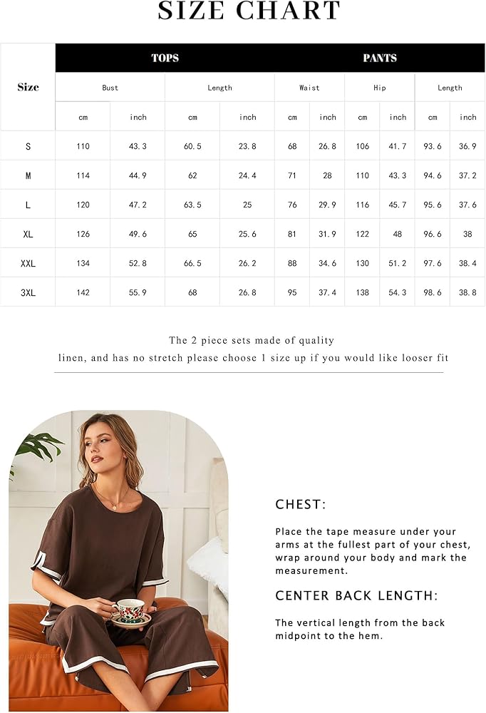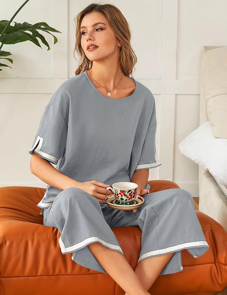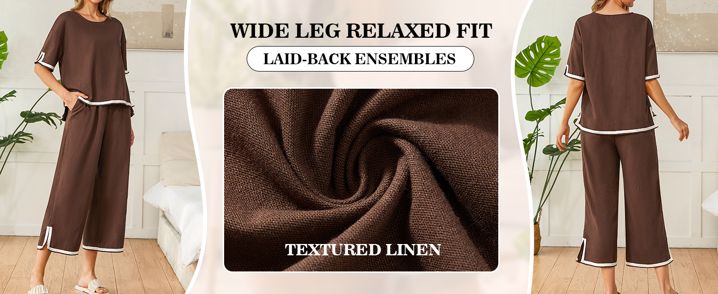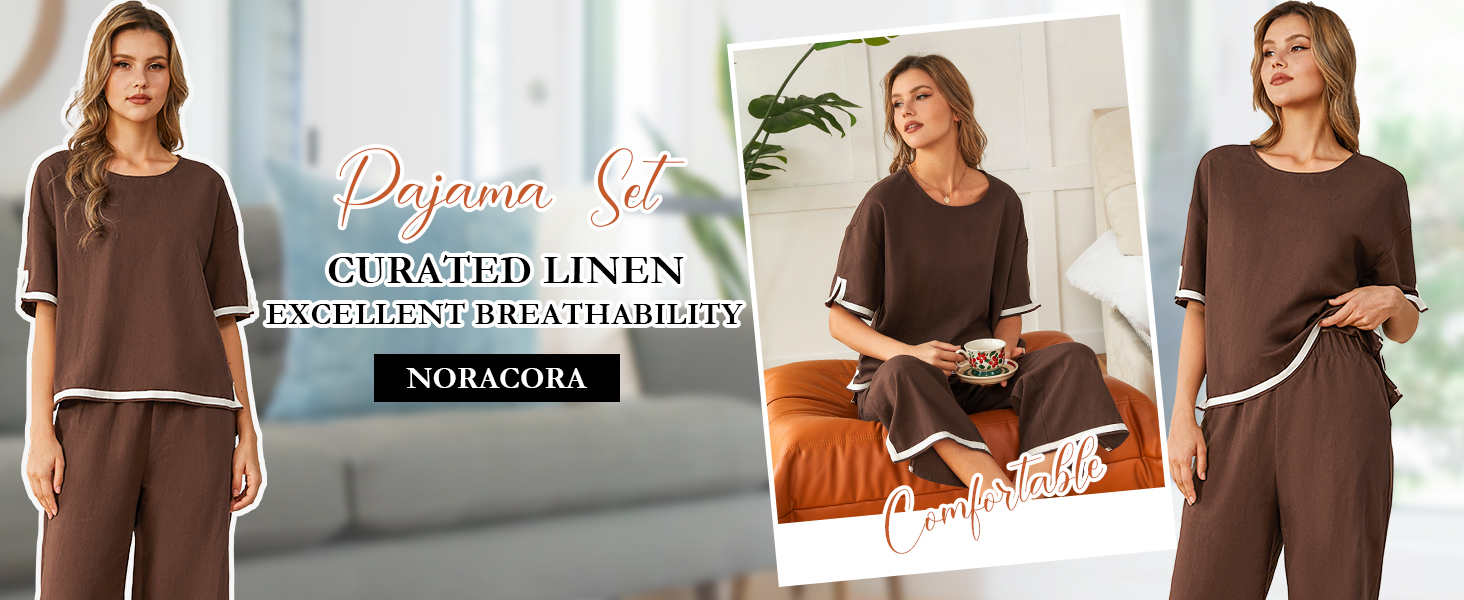مجموعات بيجامات مريحة: تتميز مجموعة البيجامات للسيدات بتصميم واسع مستقيم الساق ومساحة واسعة للحركة، وتفاصيل مقطوعة حول الحاشية المشقوقة، وحزام خصر مرن لملاءمة مريحة. أكمام قصيرة مع بنطال كتان مطابق، ينضح هذا الطقم بالأناقة السهلة