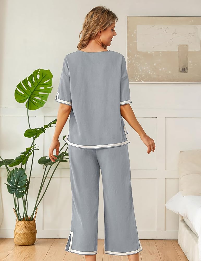 متعددة الاستخدامات: مجموعة ملابس نوم من الكتان مكونة من قطعتين للصيف توفر مظهرًا مريحًا وجذابًا، مع حاشية مقسمة ووصلات، فهي لا تضيف فقط إلى الأناقة والراحة ولكنها توفر أيضًا الدفء، مما يجعل قمصان البيجامات والسراويل مثالية لليالي الباردة أو الصباح البارد، طبقات أو ارتداء وحدها