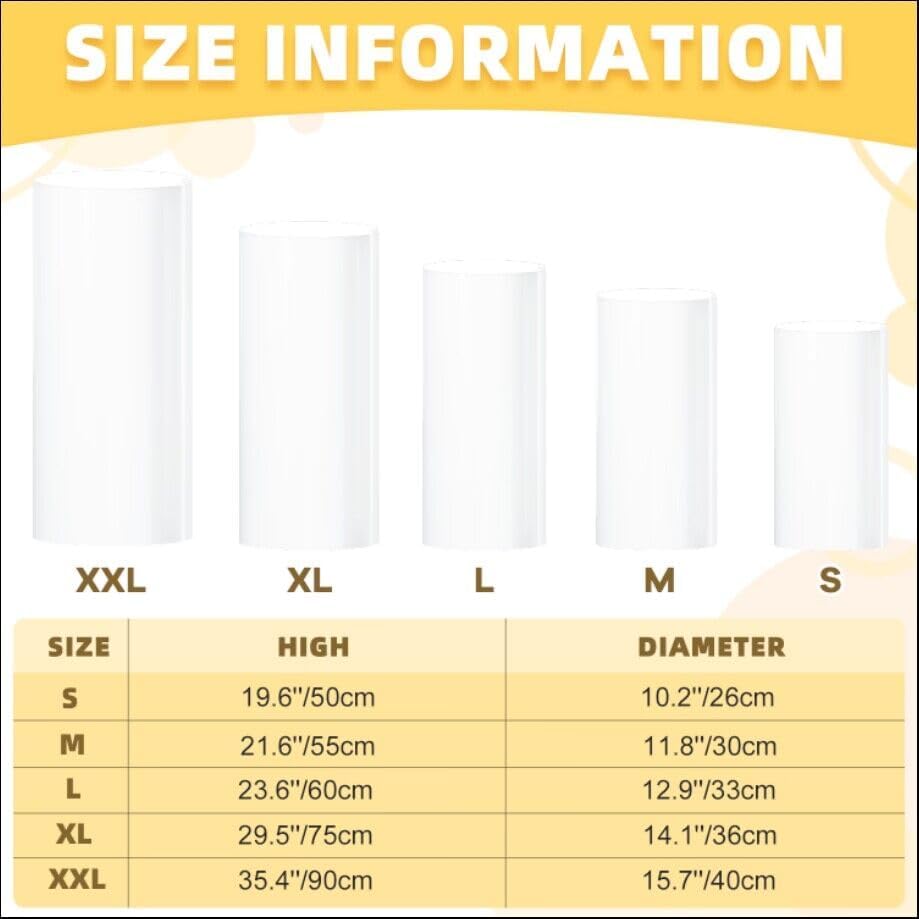 🧸【معلومات المقاس - حوامل أسطوانية للحفلات】تتضمن العبوة مجموعة من 5 حامل بقاعدة أسطوانية بيضاء، 15.7 × 35.4 بوصة (XXL)، 14.2 × 29.5 بوصة (XL)، 13 × 23.6 بوصة (طول)، 21.65 × 11.8 بوصة (وسط)، 19.6 × 10.24 بوصة (صغير). خمسة أحجام مختلفة من حوامل الأسطوانات لتمنحك الاختيار الكامل.