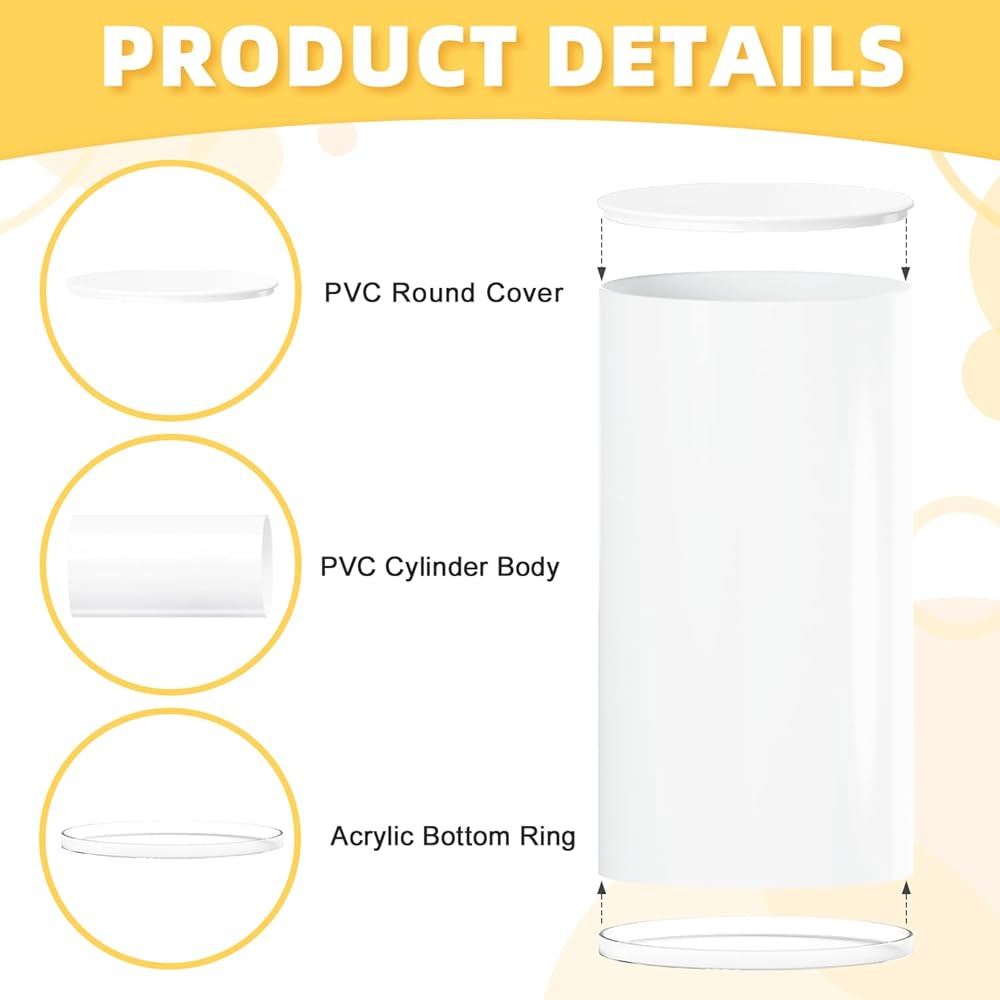 🧸【مادة عالية الجودة - قاعدة أسطوانية】حامل القاعدة للحفلات مصنوعة من مادة البولي فينيل كلوريد الفاخرة، كل منها مكون من ثلاثة أجزاء من جسم الأسطوانة، وغطاء دائري وحلقة. من المؤكد أن حامل أسطوانة الكيك سيكون نقطة محورية في حفلة الاحتفال الخاصة بك.