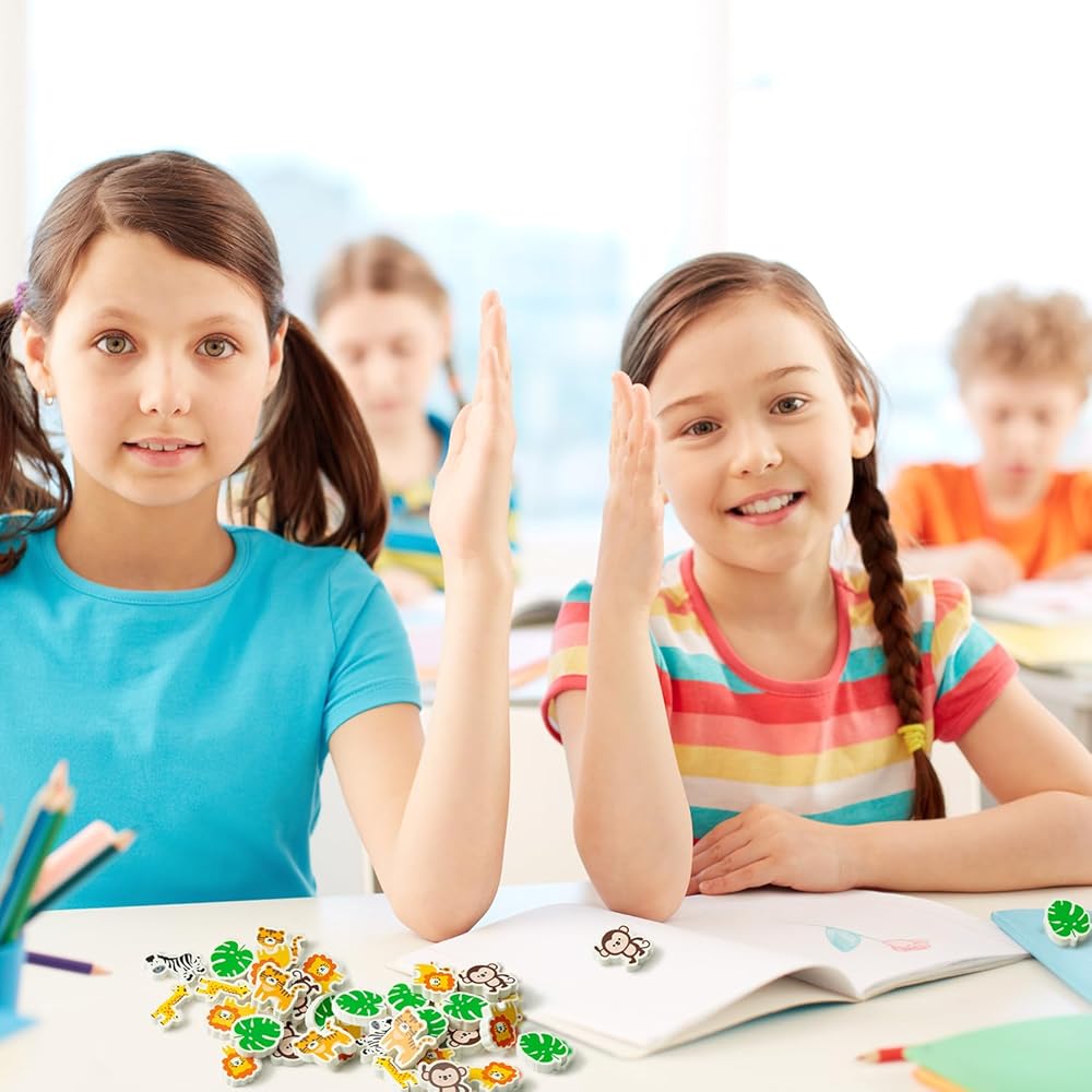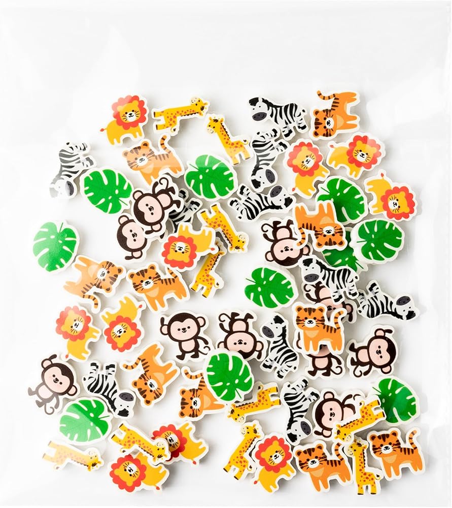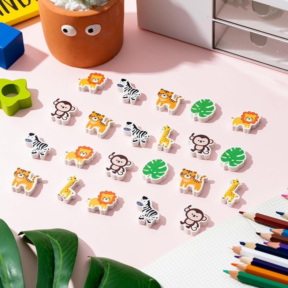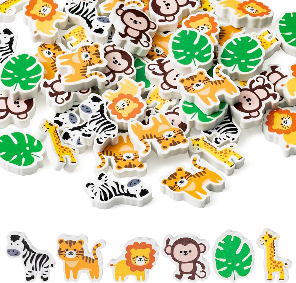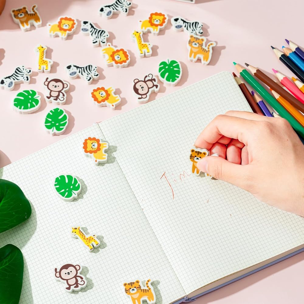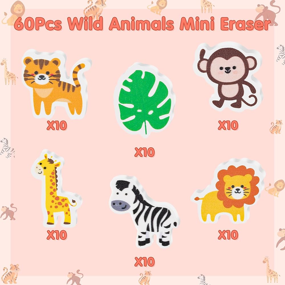Cute Animals Design: This set of 60 erasers features vivid, life-like designs inspired by wildlife. Like monkey, tiger, zebra, giraffe and more. each eraser shows a different wildlife image, adding a vivid splash of color to your learning and creativity.