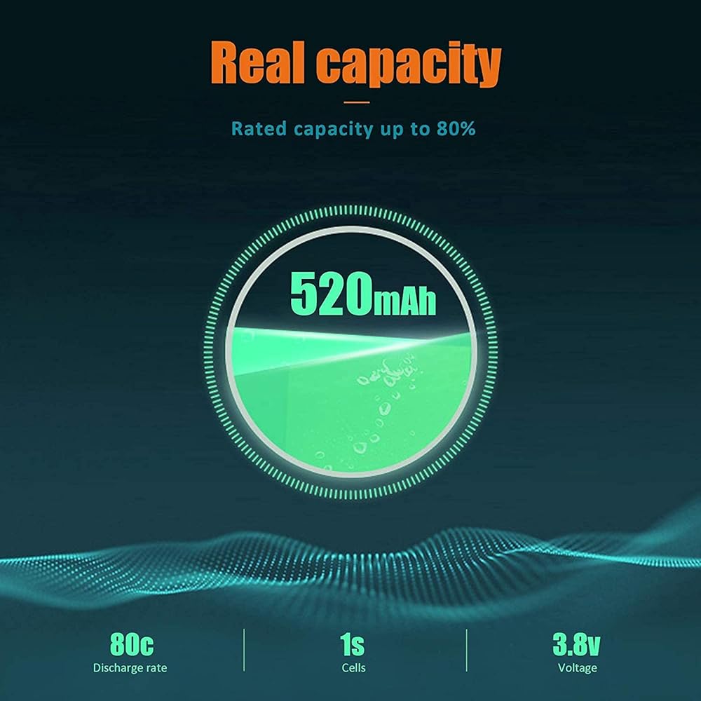 • 【Small Size】Small size of 64 * 15 * 6 mm,The weight of the 520mAh 1S Lipo battery is 13.42g heavier than the 450mAh battery, better performance than it