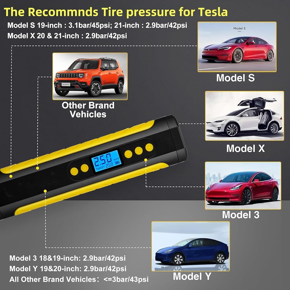 🚗【منفاخ إطارات صغير لـ Tesla】🚗: جسم صغير. ضاغط الهواء لإطارات تسلا صغير الحجم وخفيف وسهل الحمل والسفر. يحتوي KIKIMO لضاغط الهواء المحمول TESLA Model 3 على 4 قيم للوحدات مثل PSI وBAR وKPA وKg/cm²، معدة مسبقًا ومراقبة ضغط الإطارات، ويتم إيقاف تشغيله تلقائيًا عند الوصول إلى الضغط المطلوب. يرجى ملاحظة أنه بعد 10-15 دقيقة من الاستخدام المستمر اترك مضخة هواء السيارة TESLA ترتاح وتبرد لمدة متساوية من الوقت على الأقل قبل مواصلة الاستخدام.