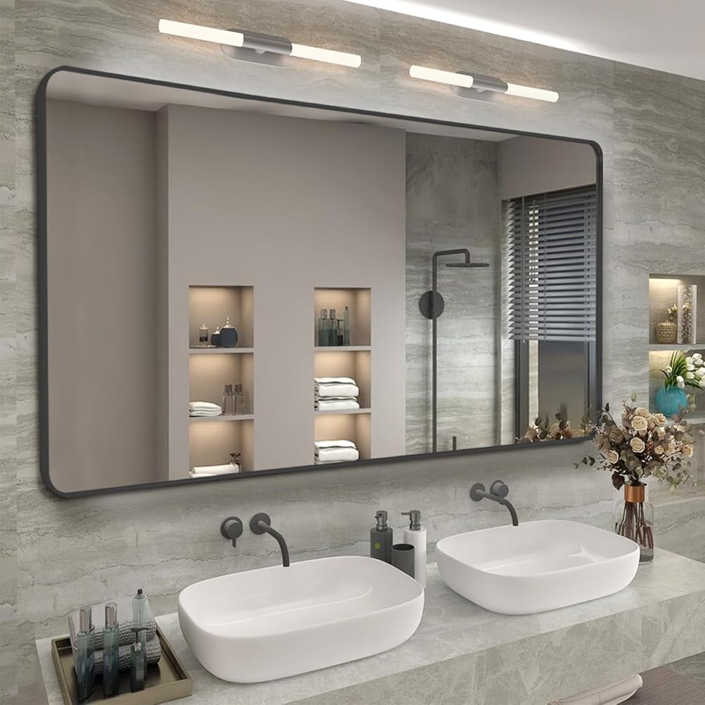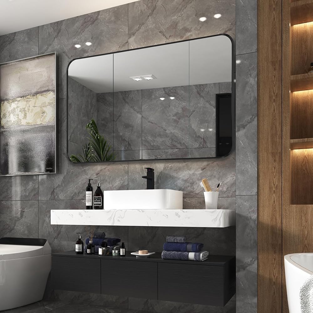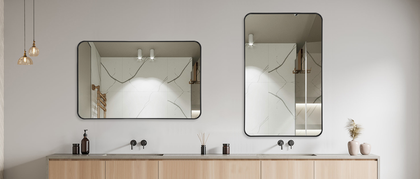 【 مرآة عملية وزخرفية مؤطرة】 يبلغ مقاس هذه المرآة المثبتة على الحائط 48 × 30 × 1.2 بوصة وهي مرآة مستطيلة بإطار معدني أسود بزوايا مستديرة. تعتبر هذه المرآة المستطيلة خيارًا ممتازًا لطاولات الزينة وطاولات الحمام ومعلقات الحائط، مما يجعل المساحة أكبر وأكثر إشراقًا.