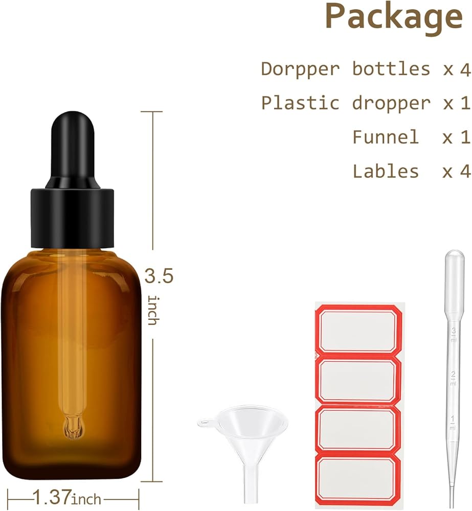 • يشتمل على: 4 عبوات من زجاجات قطارة العين الزجاجية سعة 1 أونصة (30 مل) + عبوة واحدة من أقماع صغيرة + 4 قطع من الملصقات.