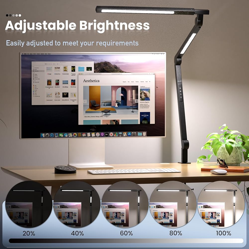 مصباح مكتب، ضوء مكتب مع مشبك، تعتيم بدون خطوات ودرجة حرارة لون قابلة للتعديل، مصباح معماري حديث للعناية بالعين مع وظيفة الذاكرة والتوقيت للدراسة والعمل والمنزل والمكتب، 15 وات