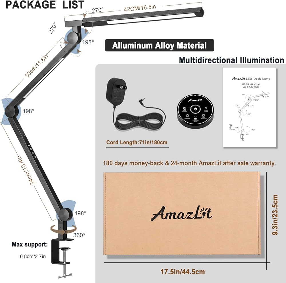 • ❤ [مشبك معدني قوي، ذراع متأرجح طويل ومرن] - مشبك معدني عريض جدًا يأتي مع وسادات سيليكون. يدعم المشبك القوي سطح المكتب الذي يصل إلى 2.7 بوصة/ 6.8 سم ويثبت مصباح الذراع المتأرجح في مكانه بشكل آمن. توفير المساحة والحفاظ على نظافة سطح المكتب. مع تصميم متعدد الاستخدامات ذو 6 محاور، وزوايا قابلة للتعديل بحرية وأوضاع متعددة، يمكنك ضبط اتجاه الضوء وفقًا لاحتياجاتك الشخصية