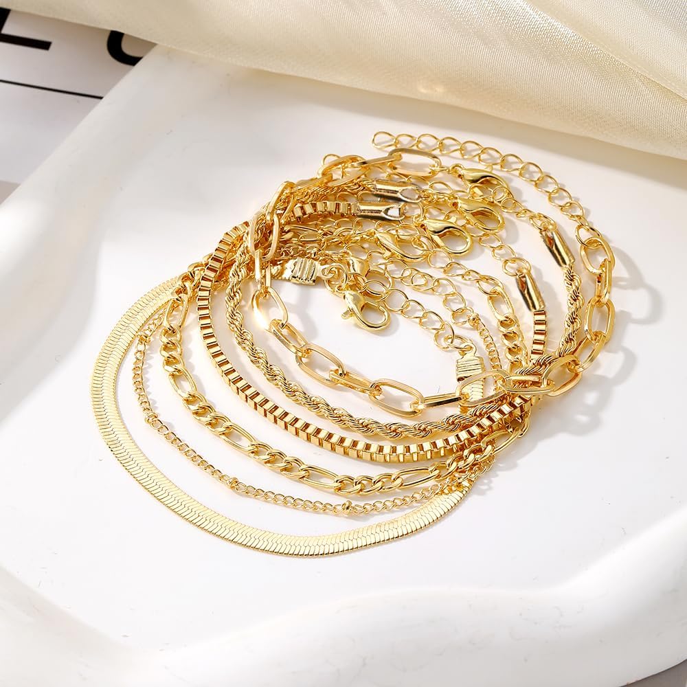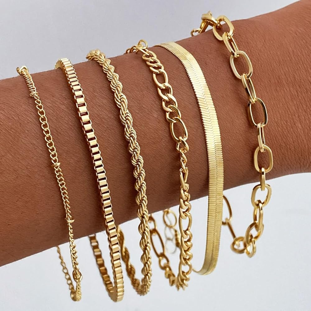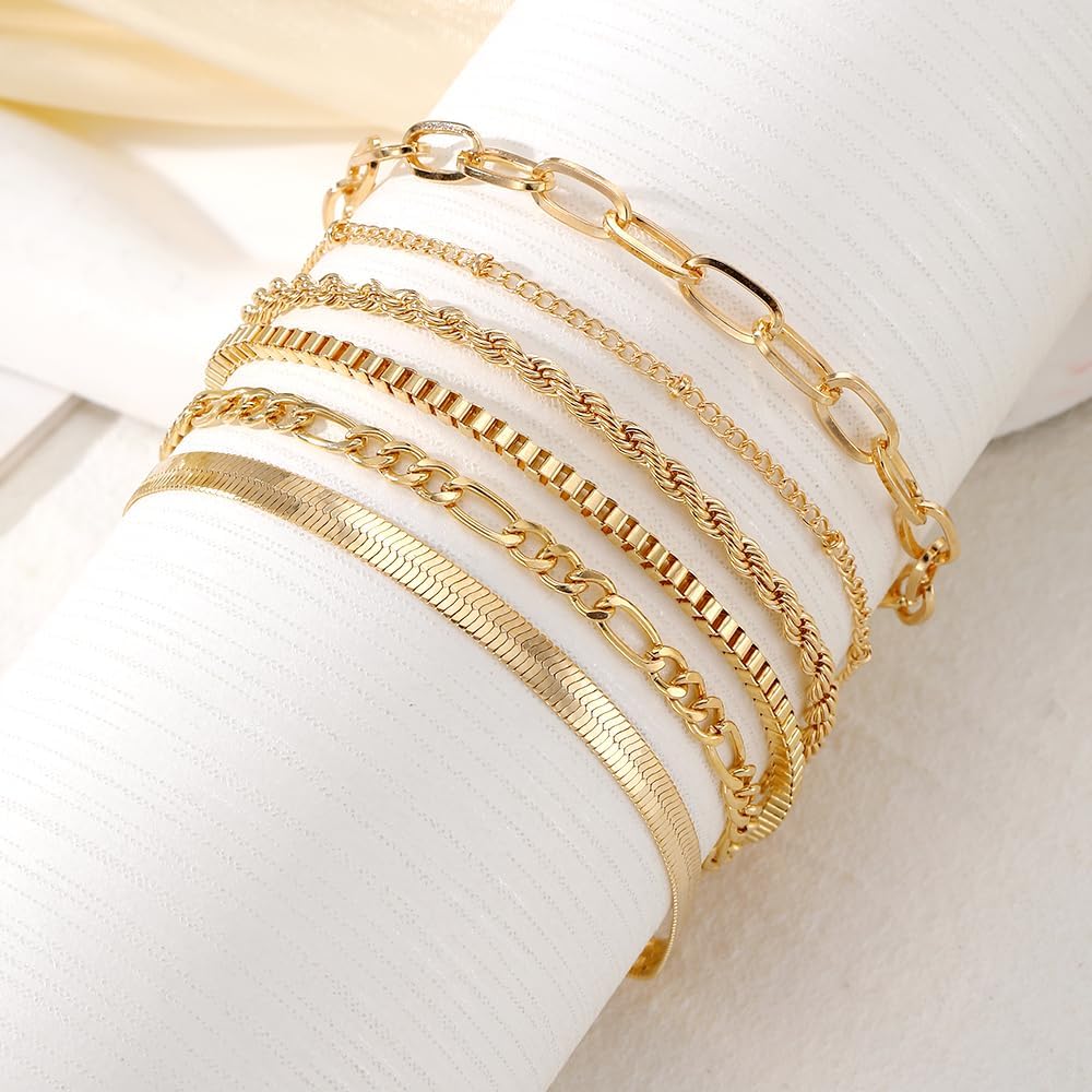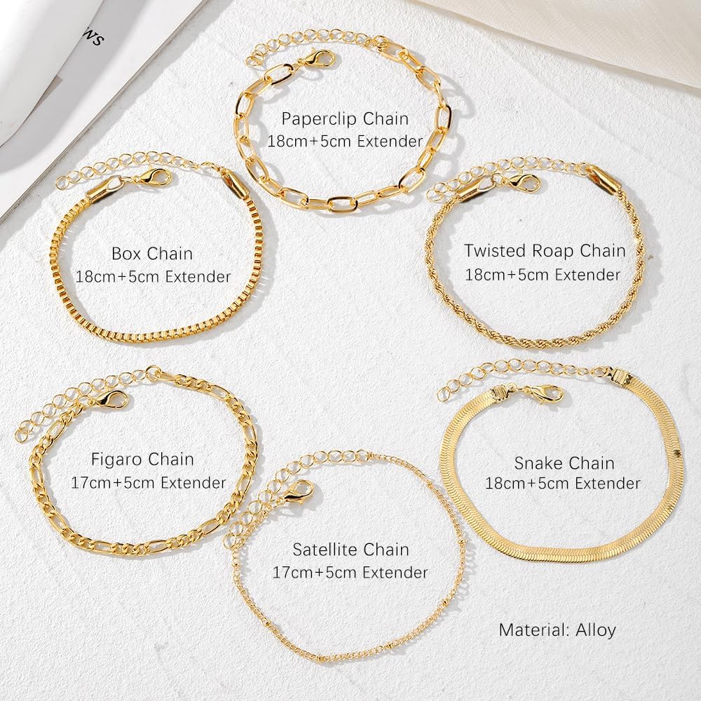 مجموعة من 6 أنواع مختلفة من الأساور: تتضمن سلسلة الثعبان، وسلسلة صندوقية، وسلسلة حبل، وسلسلة ستالايت، وسلسلة فيجارو، وسلسلة مشبك ورق. مجموعة أساور بسيطة وأنيقة.