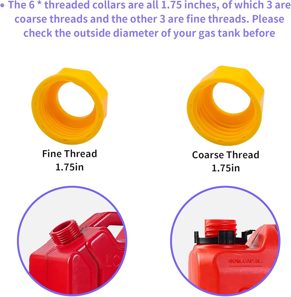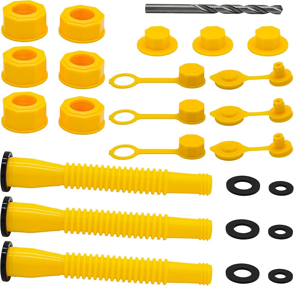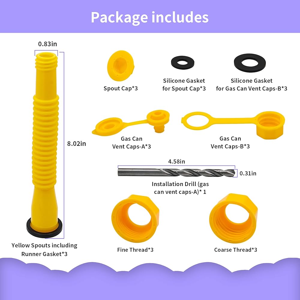 6 Screw Collar Caps(3 Coarse Thread &3 Fine Thread) 3 yellow Spouts and rubber gaskets, 3 nozzle caps with threads, 2 kinds of gas can vent caps, And the drill bit required to install the gas discharge cap