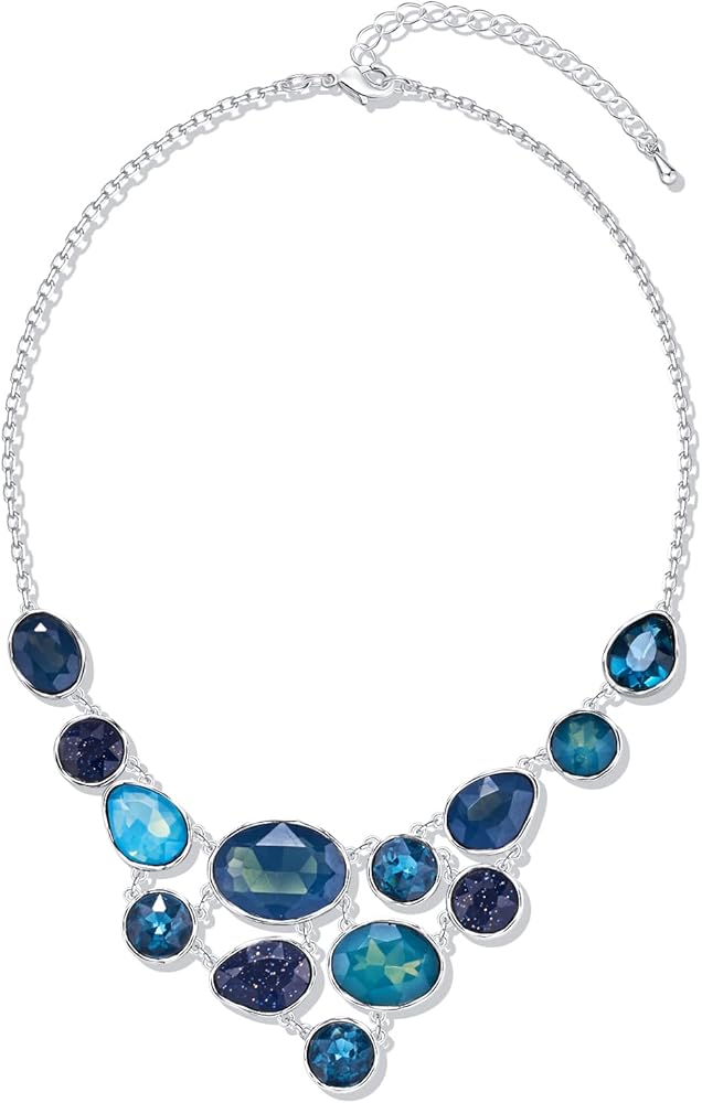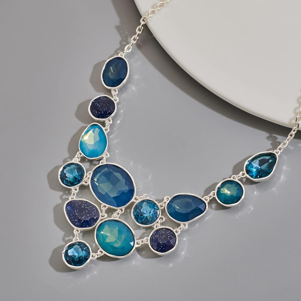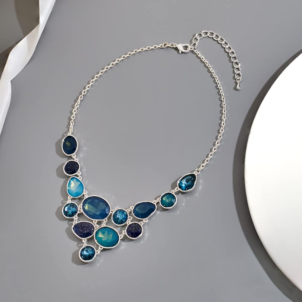 Statement Necklace Design: This silver necklace for women is designed with sliver oval chain and shinny resin stones in blue colors. It makes you charmer and elegant, beautiful and attractive.