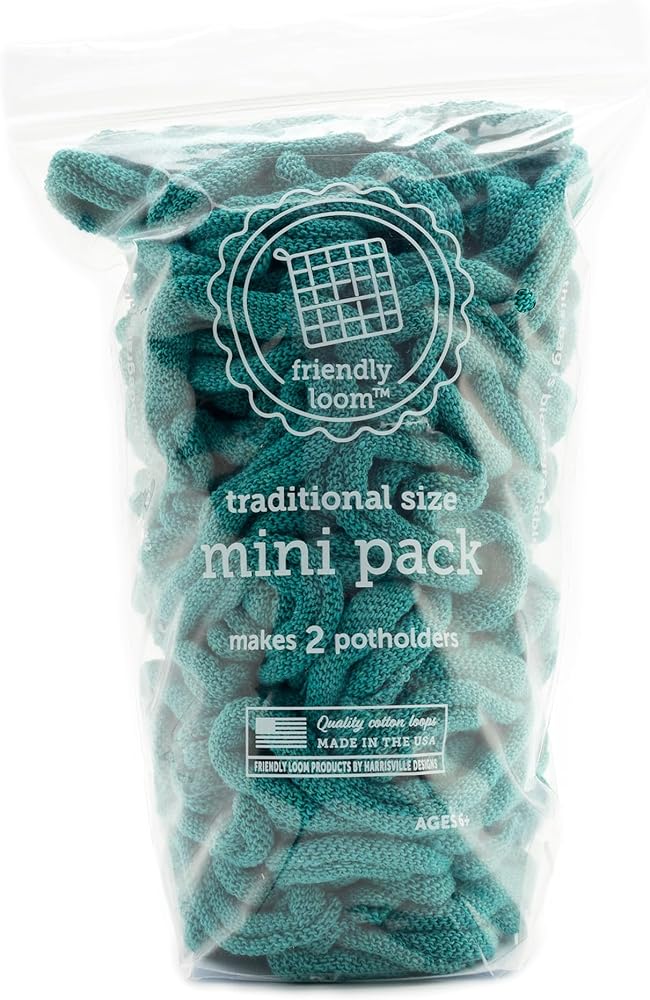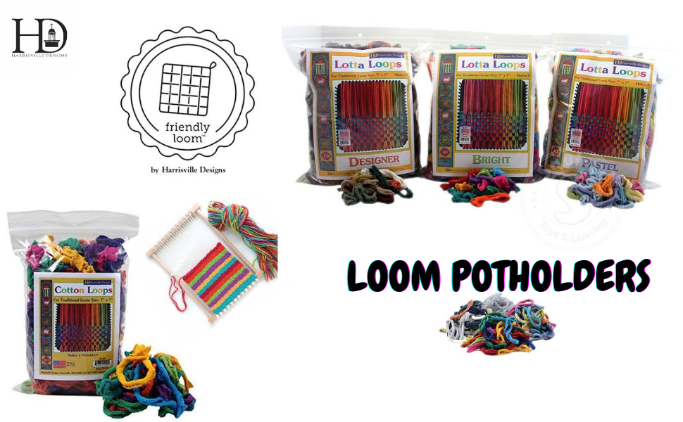 With Harrisville Designs Traditional Cotton Loops, you get a pack of loops in assorted colors, custom sized for Harrisville's 7'' x 7'' traditional potholder loom (loom sold separately). The bag contains enough cotton loops to weave 2 potholders (6" x 6" finished size). These loops are available in 34 beautiful colors. Children can enjoy this quiet-time activity, perfect for rainy days, play dates or car trips. While having fun, they are learning hand-eye coordination, patterning, and refining fine motor skills. Hand weaving, knitting and felting are wonderful intergenerational activities your whole family can share. These loops do not fit the larger-size Harrisville Potholder PRO Loom (sold separately). All Harrisville products are made in the USA. From the Manufacturer Established in 1971, Harrisville is a small, family-owned and operated business. We believe that quality should not be compromised for even the smallest product. Our goal is to preserve and share the textile heritage of our small New Hampshire village, by providing the highest quality materials for easy projects you and your children can make at home.