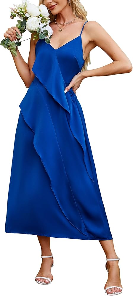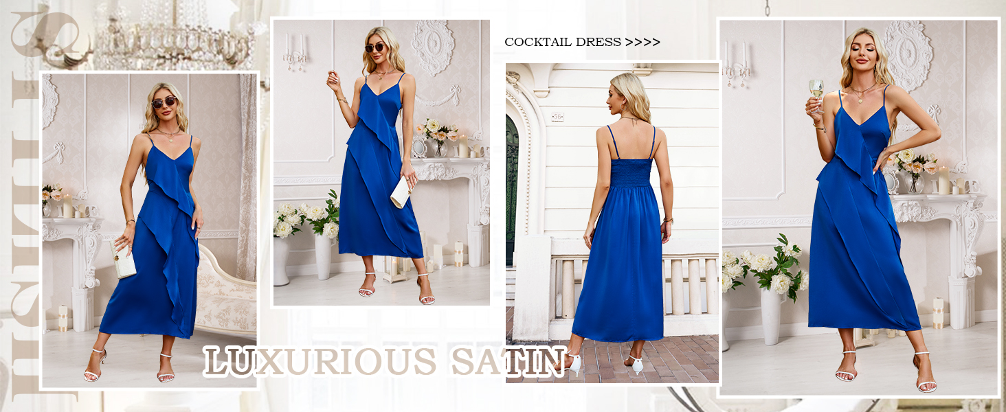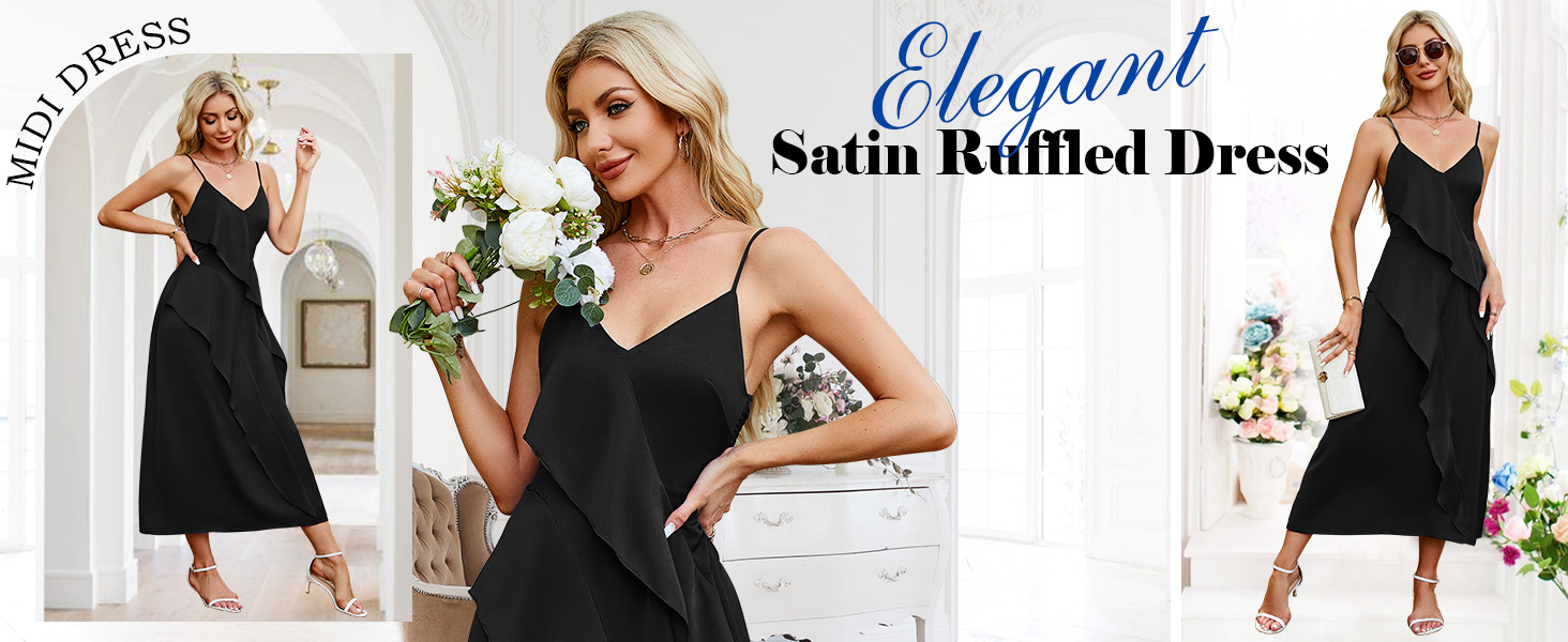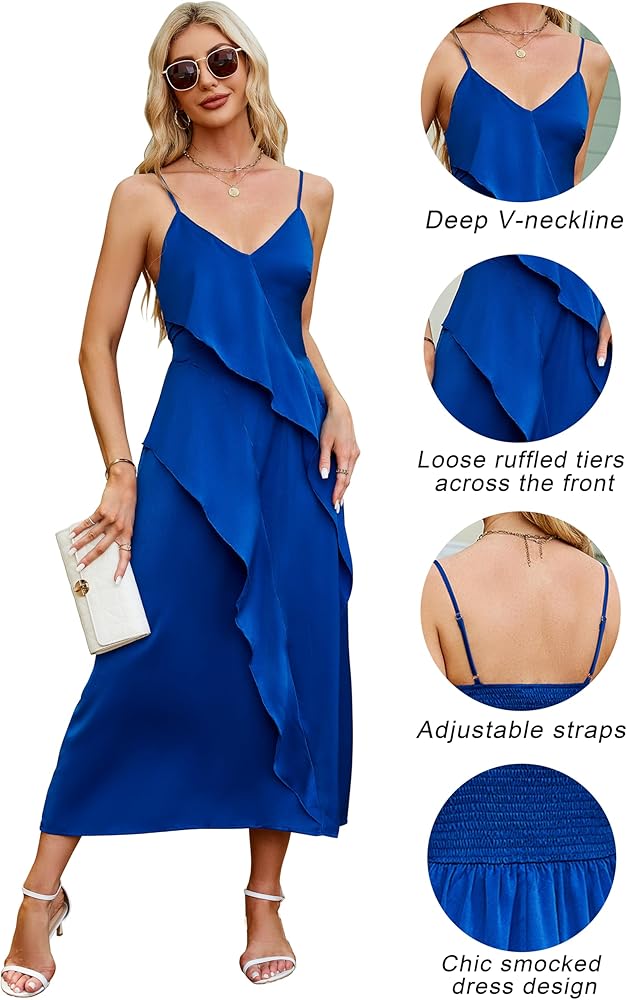 【تصميم فريد】حزام قابل للتعديل، خط عنق عميق على شكل حرف V، طبقات فضفاضة مكشكشة بنعومة على الجهة الأمامية، سوف يجذب منحنياتك. تصميم فستان من الساتان بشريط سباجيتي قابل للتمدد، يناسب معظم أشكال الجسم، وسهل الارتداء والخلع.