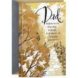 Cover of multipaneled card features an abstract illustration of a wooded landscape with text that reads: "Dad, Through thick and thin, through changes and challenges, through memorable times and milestones, you've been there."
