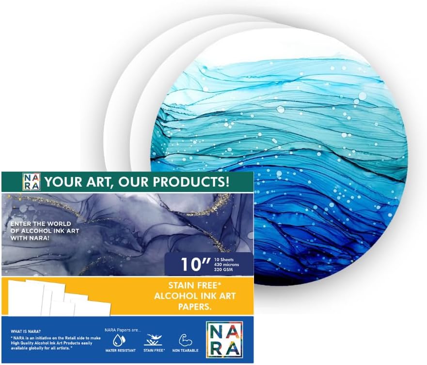 NARA Papers Alcohol Ink Paper for Alcohol Ink Painting are High Quality 100 percentage Stain Free, Durable Long Lasting on Shelf, Non Tearable and Waterproof. NARA Papers are available in Pre Cut Sizes and Shapes (Rectangle, Square, Circle) and they come in 3 main sub categories to chose from in terms of Thicknesses (Microns) and Weights (GSM), 1. Medium 275 Microns 200 GSM, 2. Medium Plus 330 Microns 250 GSM, 3. Heavy 430 Microns 320 GSM. This high quality Synthetic paper can be used for Alcohol Ink Painting, Acrylic Painting, Watercolor Painting and more. NARA offers Customization options to Artists, Painters etc. Follow us on Instagram narapapers
