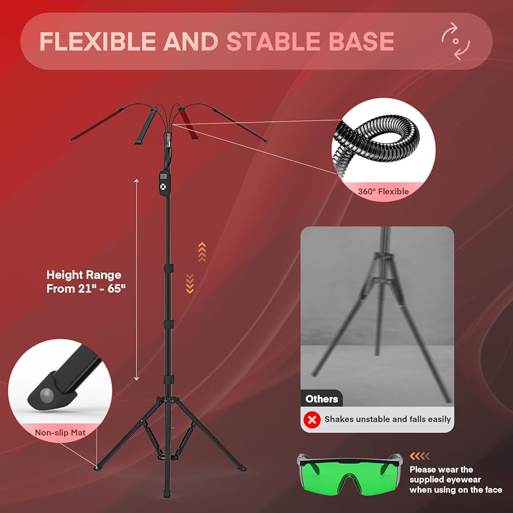 🎀【مريح وسهل الاستخدام لتوفير الراحة المثلى】مصباح الضوء الأحمر بالأشعة تحت الحمراء الخاص بنا مريح ومتعدد الاستخدامات. يتميز بحامل ثلاثي القوائم قوي وقابل للطي لدعم ثابت، وارتفاع قابل للتعديل (21 بوصة - 65 بوصة)، وأنبوب مرن مع 4 رؤوس مصابيح يمكن تدويرها 360 درجة للحصول على إضاءة دقيقة. على الرغم من ميزاته الرائعة، فهو يزن 4.6 رطل فقط لسهولة الحمل والتخزين.