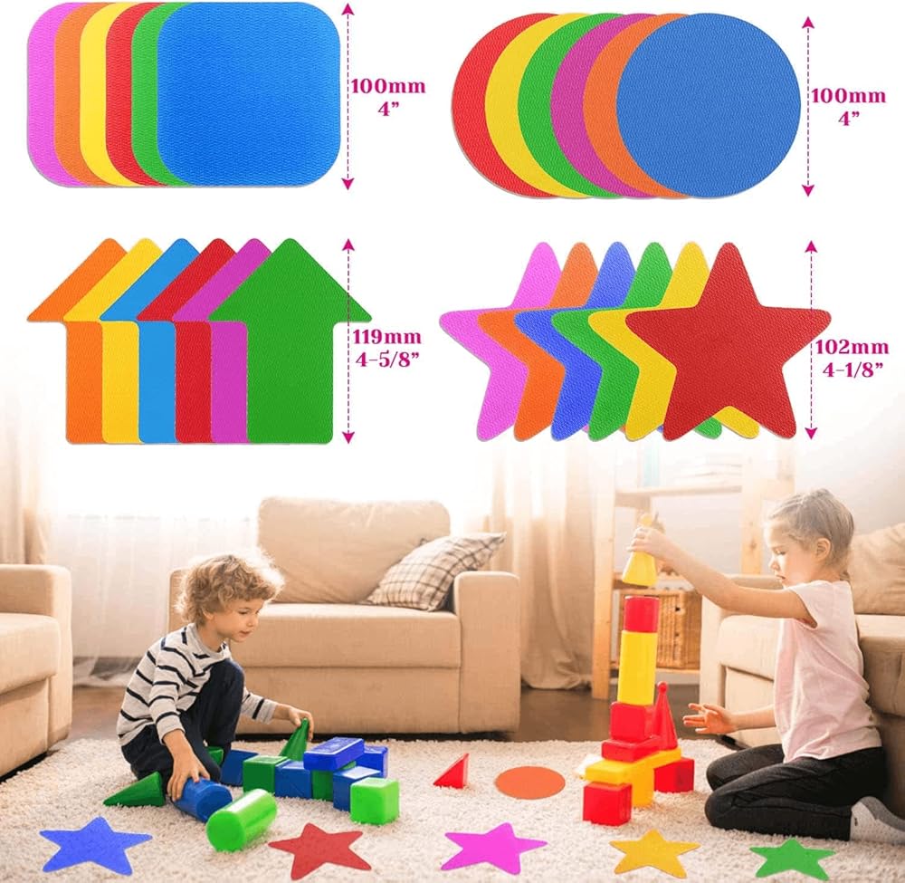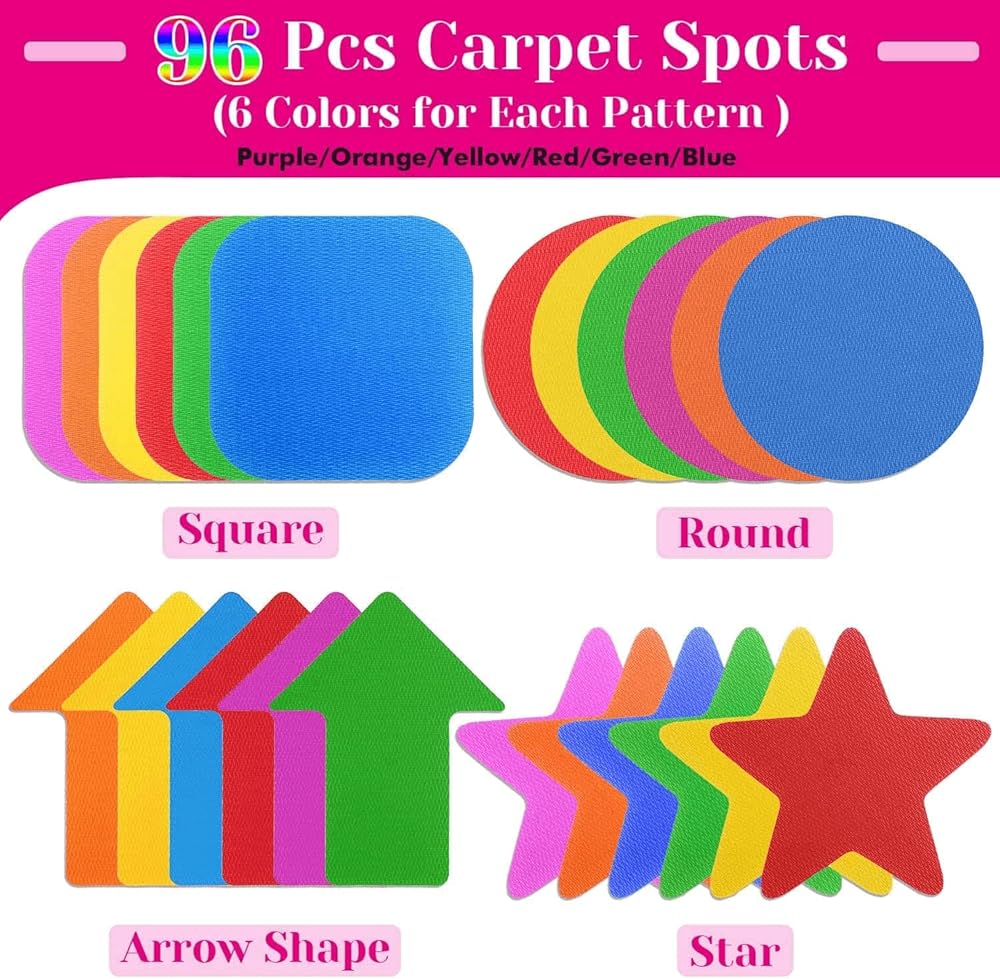 • 【4 PATTERNS & 6 COLORS】Mckanti Carpet spot makers comes with total 96 pieces Velcro dots, including star, square, arrow and circle shape, each shape with 6 colors red, yellow, blue, green, orange, and purple. These vibrant colors can easily attract children's attention.