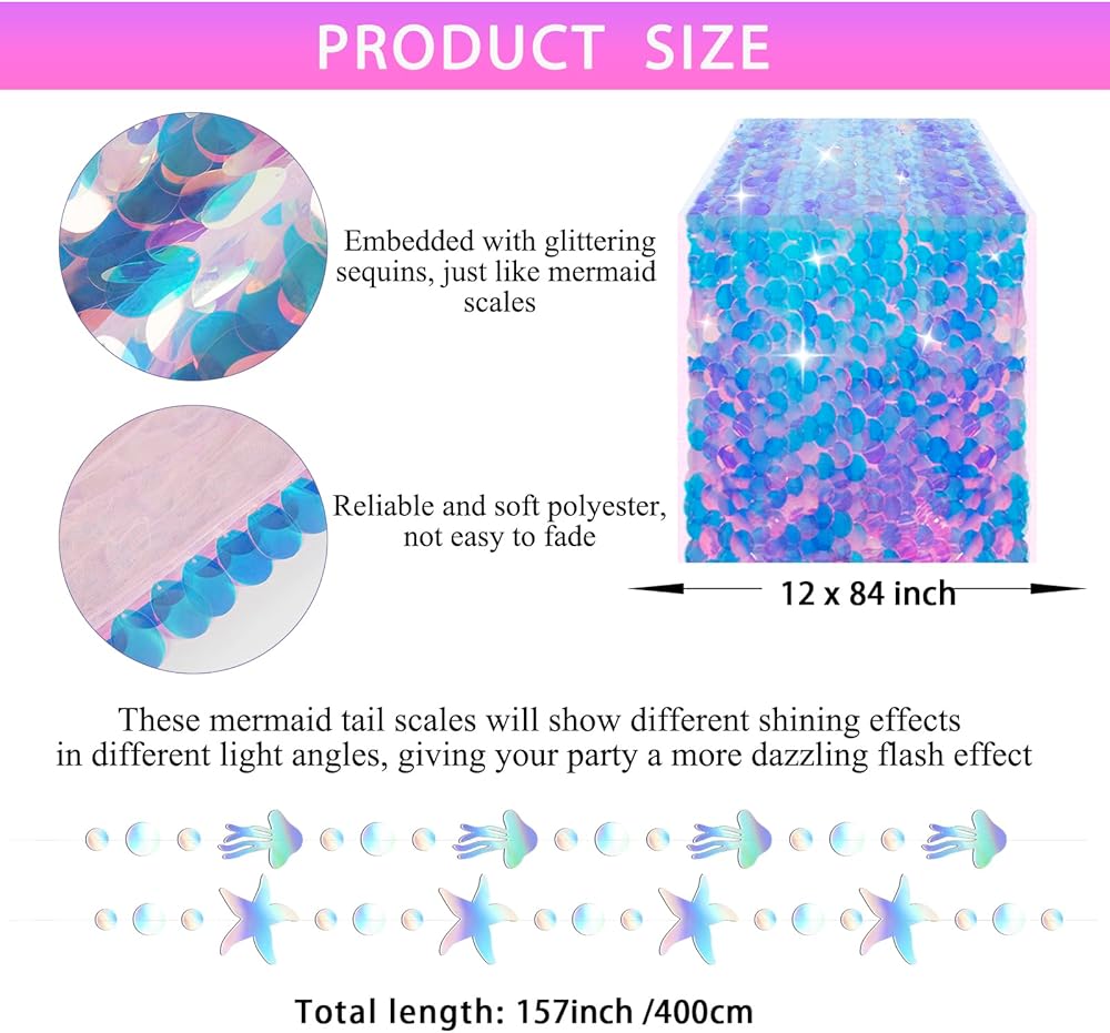 🎀【مظهر نابض بالحياة ولافت للنظر】 بمقاس حوالي 12 × 84 بوصة (30 × 213 سم) لكل قطعة، فإن مفرش طاولة حفلات حورية البحر الخاص بنا مناسب لأي طاولة يصل طولها إلى 8 أقدام، ويتناسب تمامًا مع الجميع. ديكورات أخرى، تلبي احتياجات تزيين طاولة الطعام الخاصة بك. تم تصميم غطاء الطاولة المجسم بالترتر لإضافة لمسة حيوية إلى طاولة الطعام الخاصة بك، وهو ديكور مثالي لحفلات حورية البحر الصغيرة للحفلات التي تحمل طابع المحيط.