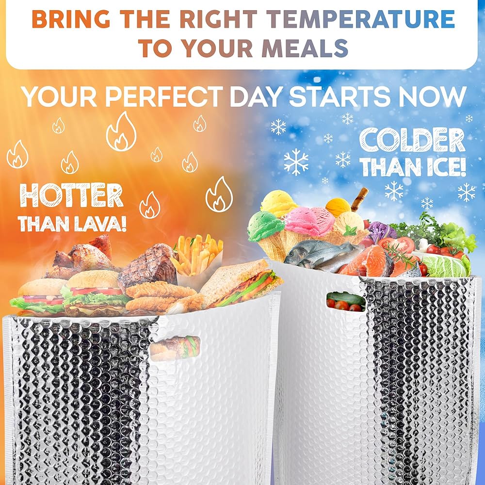 • مثالية لمجموعة متنوعة من الاستخدامات. تعتبر الأكياس الحرارية للطعام مثالية لوجبات غداء العمل أو النزهات أو حتى لتوصيلات الأعمال، فالحقيبة متعددة الاستخدامات هي الحل لحمل الطعام أو مستحضرات التجميل. التصميم الواسع لأكياس عزل الطعام يجعلها رائعة لأي مناسبة أو حاجة.