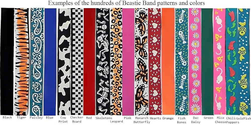 Beastie Band Cat Collars are one of the most comfortable collars on the market. They're designed by cat lovers who wanted something comfortable, safe, and long-lasting for their furry feline friends. Beastie Bands are made of soft and stretchy neoprene. It's very lightweight and stretches for safety. Can be cut to size, so getting a great custom fit is easy whether you have a tiny kitten or a massive couch potato kitty. Measures 12 1/2 inches long without being stretched. Features Velcro closure and metal eyelet for attaching ID tags. Color and pattern as shown