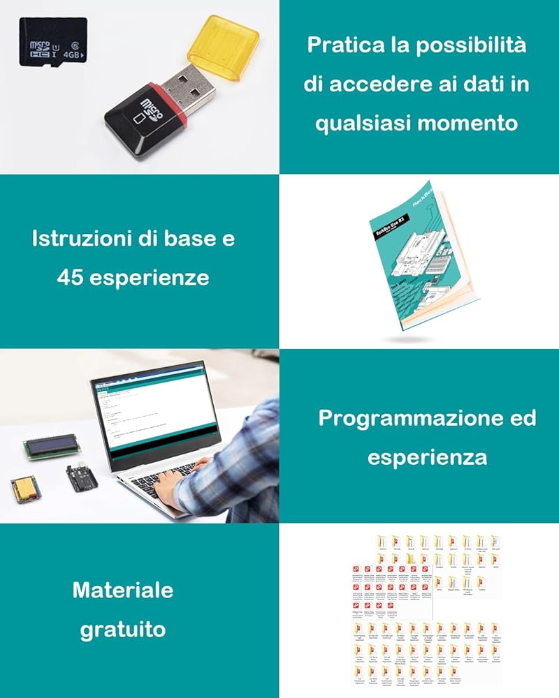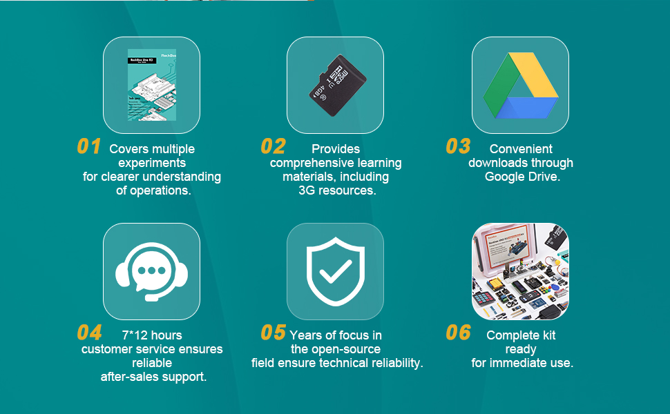 【برامج تعليمية مجانية وحزمة بطاقة SD】تتضمن المجموعة برامج تعليمية شاملة وأدلة وبطاقة SD وقارئ بطاقات. البرامج التعليمية مفصلة ولكنها سهلة الاستخدام، مما يساعدك على إتقان برمجة Arduino خطوة بخطوة. توفر بطاقة SD والقارئ مساحة تخزين ملائمة وسهولة الوصول إلى المواد التعليمية.