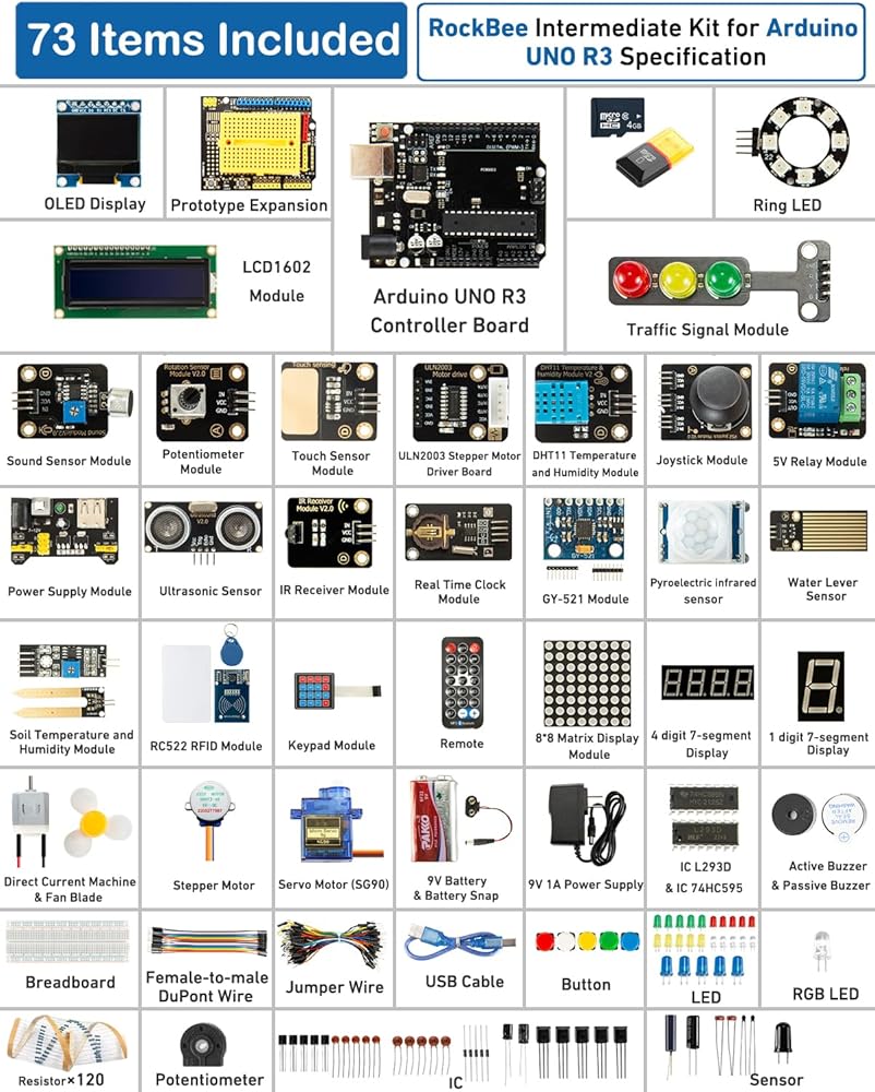 【مكونات متعددة الاستخدامات للتجارب الموسعة】 توفر مجموعة المبتدئين 73 مكونًا متنوعًا، تغطي فئات مختلفة. توفر هذه المكونات فرصًا كبيرة للتجريب، مما يتيح لك توسيع نطاقك الإبداعي وإنشاء مشاريع ذات تنوع كبير.