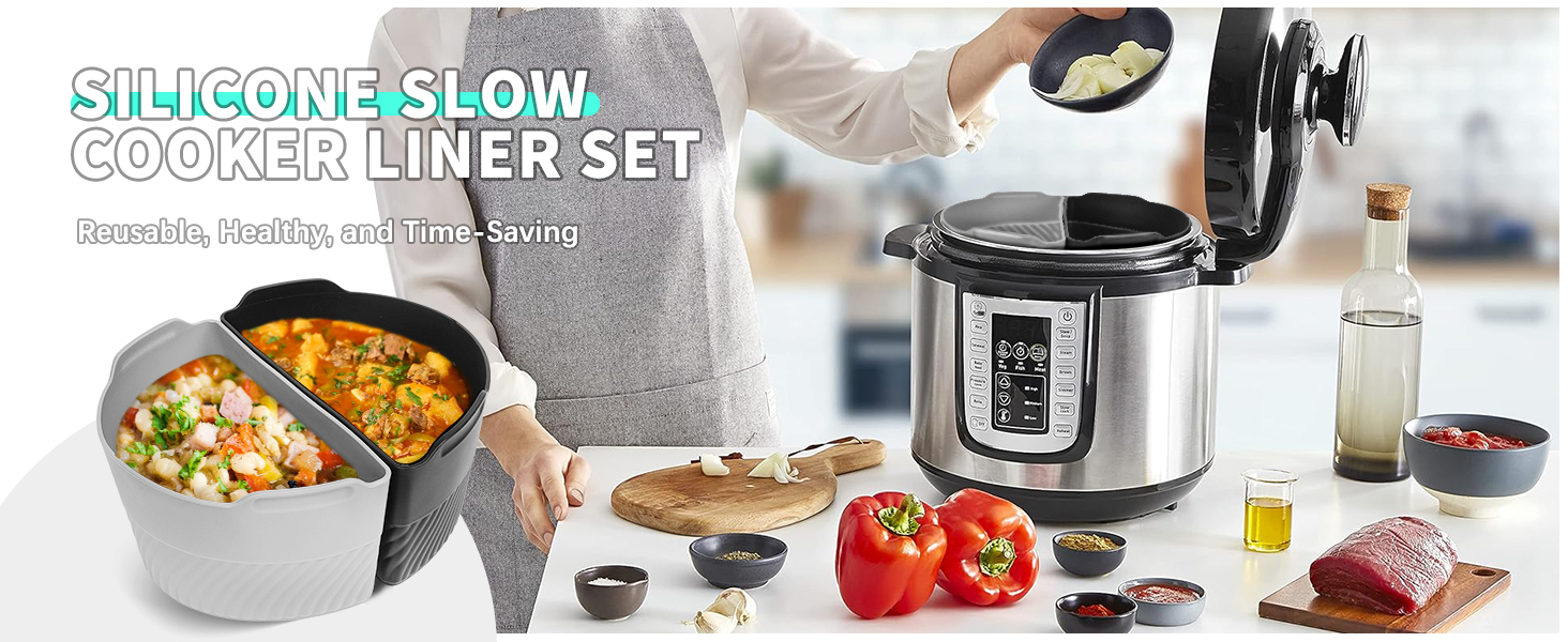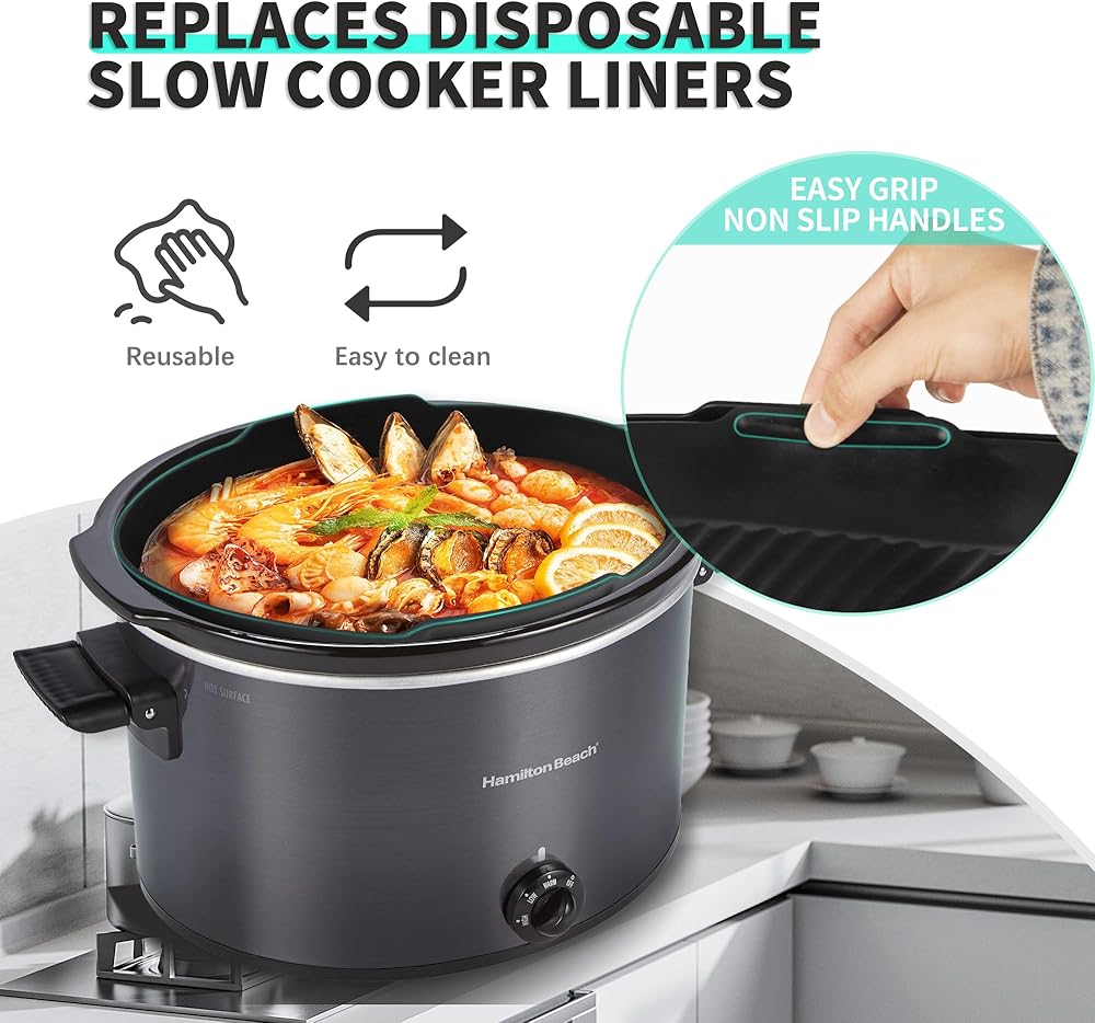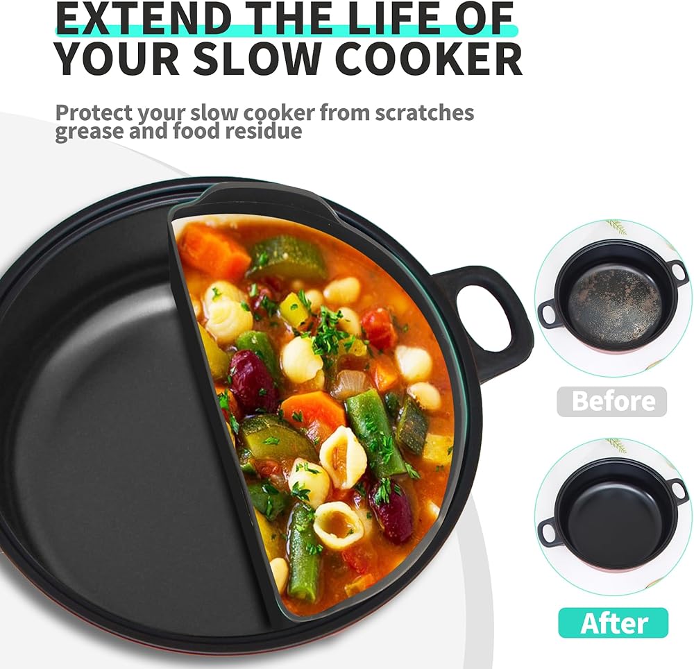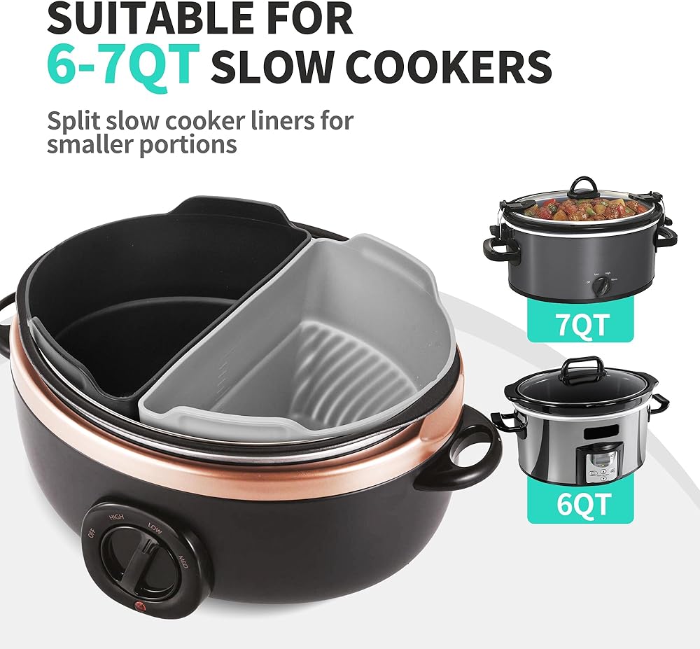بطانة وعاء الفخار من السيليكون من LAIWOO، وبطانة طباخ بطيء ومقسم وعاء الفخار لأواني الفخار 6-7QT، قابلة لإعادة الاستخدام، وسهلة التنظيف، وخالية من مادة BPA، وآمنة للاستخدام في غسالة الأطباق (مع قفازات ورف تقديم)