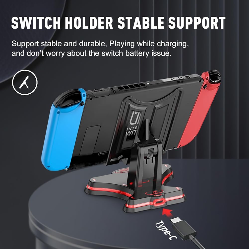 Charging Stand for Switch / Switch Lite / Switch OLED, Foldable Multi Angle Holder, Non-Slip Bracket, Switch Adjustable Charging Stand with USB Type C Charger Port 1 * color box, 1 * switch Stand , 1 * manual, 1 * USB Type C cable.