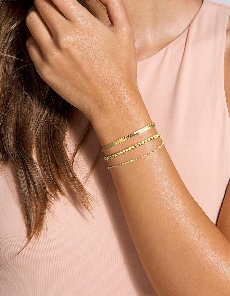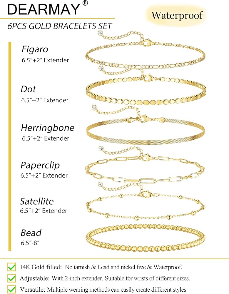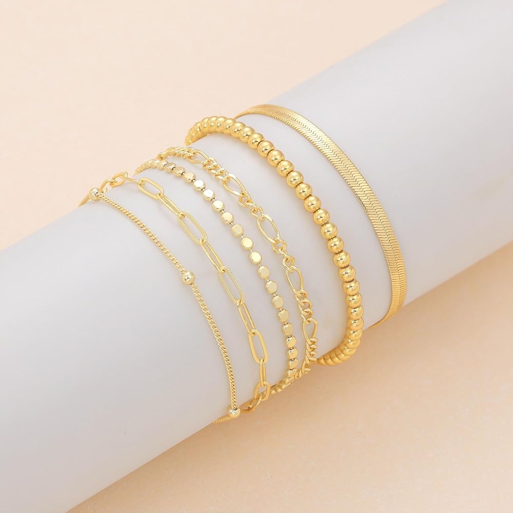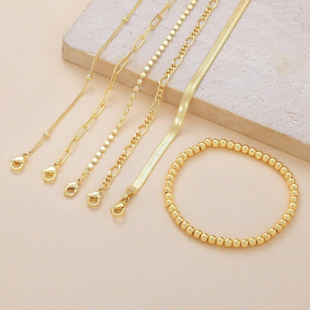 DEARMAY Dainty Gold Bracelets for Women, 14K Real Gold Jewelry Sets for Women Beaded Bracelets for Women Cuban Link Paperclip Chain Cute Bracelet Pack Gifts for Women Girls