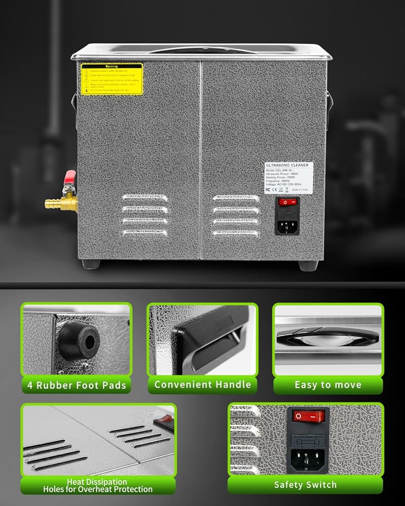 • [محولات الطاقة الصناعية]: مجهزة بمحولين صناعيين معززين، هذه الآلة التي تعمل بالموجات فوق الصوتية لتنظيف المجوهرات تتميز بقوة معززة. يتميز بقوة الموجات فوق الصوتية 120 واط وقوة السخان 100 واط.