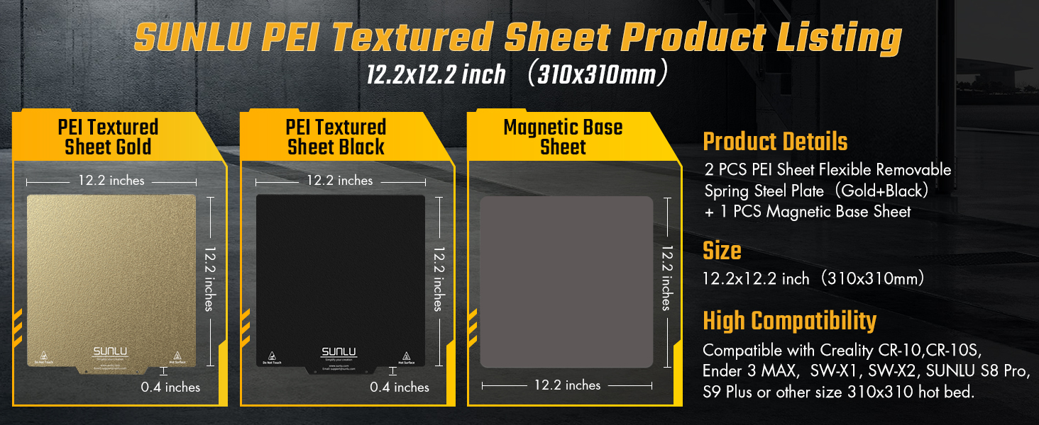 ① 【قائمة التعبئة (3 قطعة) 】SUNLU طابعة ثلاثية الأبعاد PEI حجم لوحة البناء المغناطيسية 235*235 مللي متر (9.25*9.25 بوصة). إجمالي 3 قطع من الورق: قطعتان من ورقة سطح طباعة PEI (ذهبي + أسود) وقطعة واحدة من ورقة قاعدة الملصق.