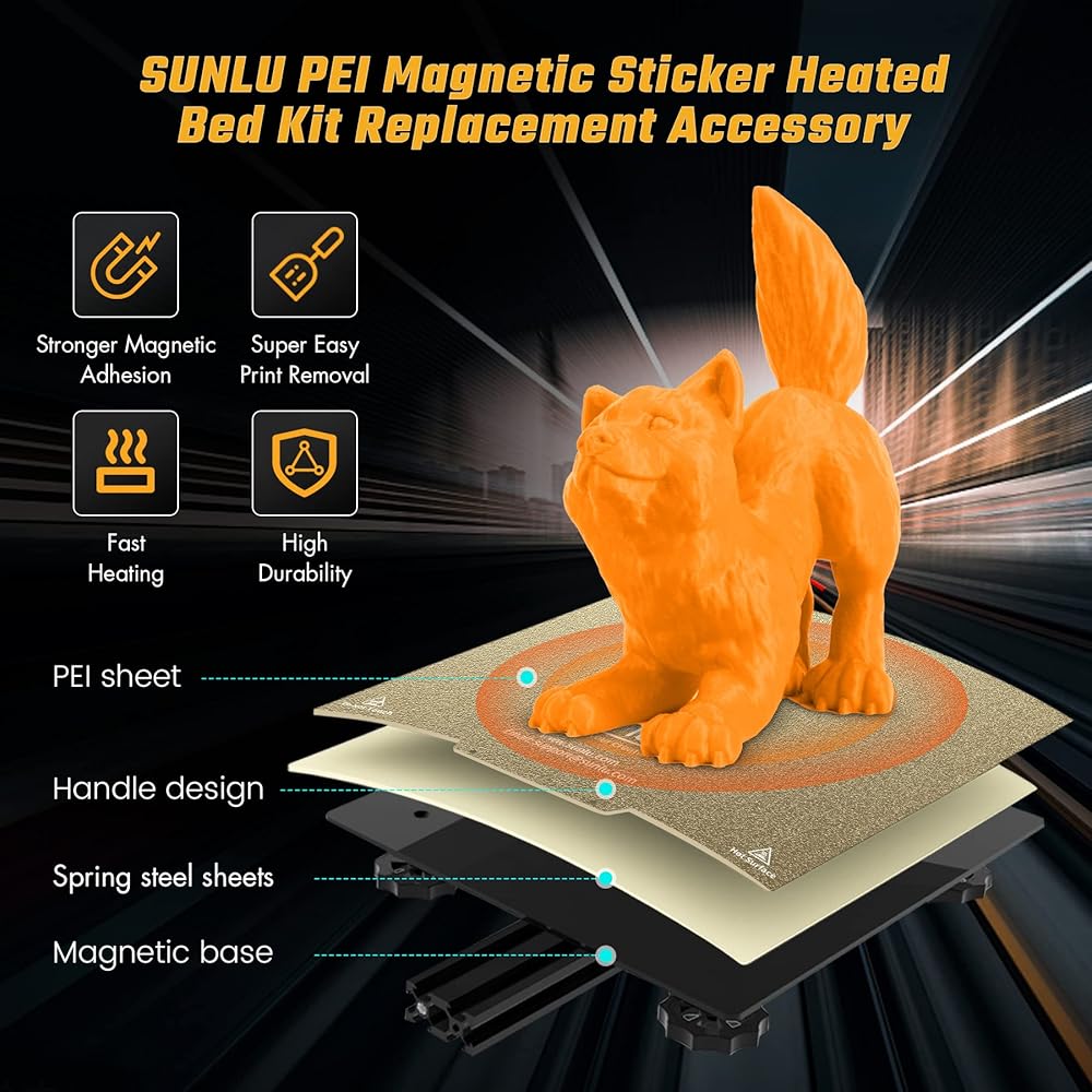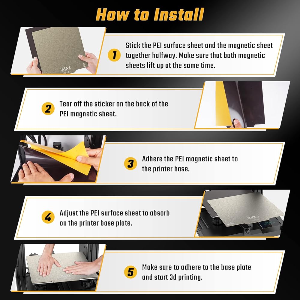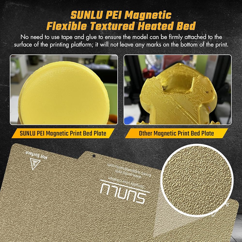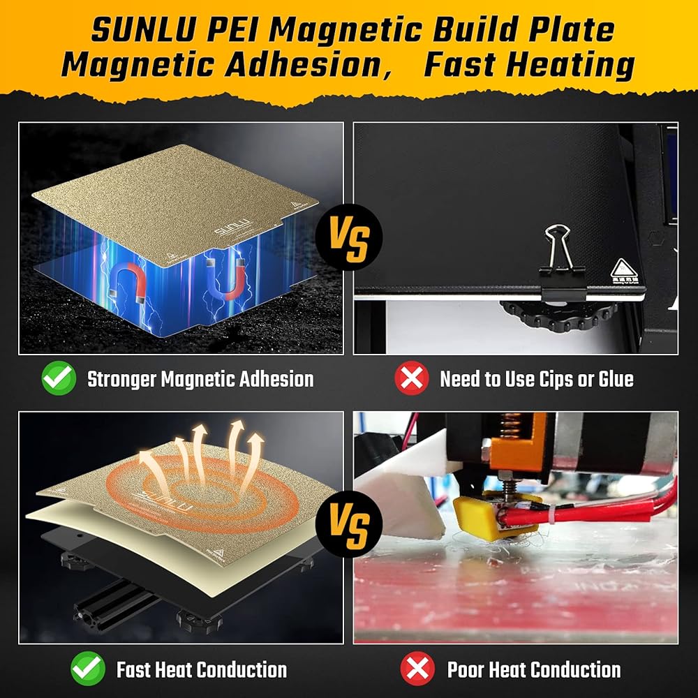 ④【التصاق مغناطيسي أقوى】سرير الطابعة SUNLU PEI ثلاثي الأبعاد أكثر مرونة ومقاومة للانحناء. التصاق رائع للطبقة الأولى، تأكد من إمكانية ربط النموذج بقوة على سطح منصة الطباعة. تتمتع منصات سرير الطابعة ثلاثية الأبعاد المغناطيسية SUNLU بالتصاق قوي و سارت الطباعة بشكل جيد.