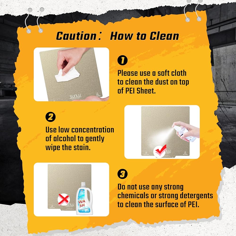 ③[المتانة وسهلة التنظيف] تتميز لوحة البناء المغناطيسية SUNLU PEI بعمر خدمة طويل من الفولاذ المقاوم للصدأ. يستخدم لاصق سرير الطابعة SUNLU PEI ثلاثي الأبعاد قطعة قماش ناعمة لتنظيف الغبار. امسحي البقعة بلطف بتركيز منخفض من الكحول.