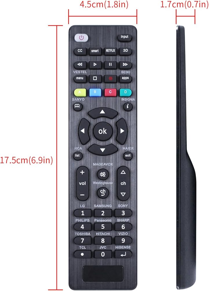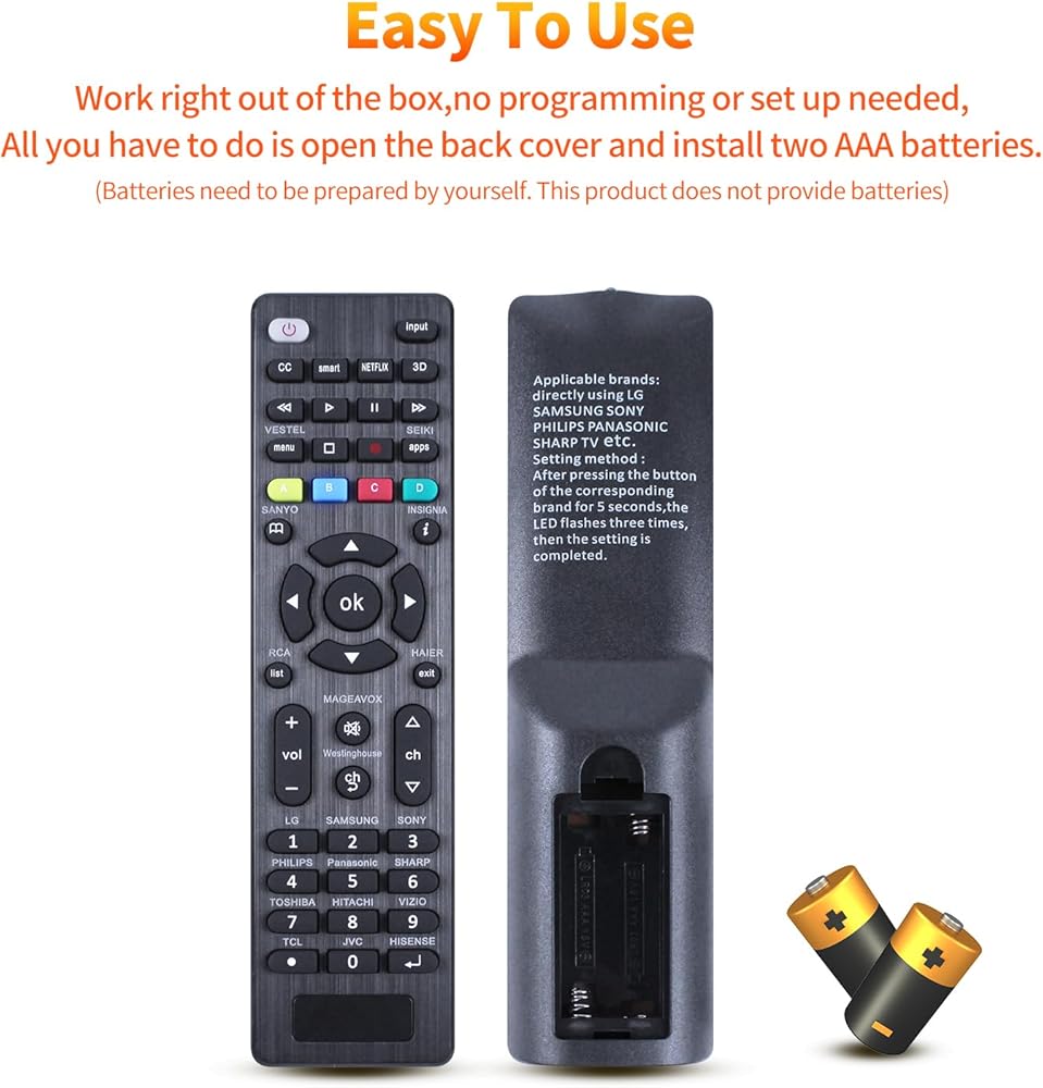 يمكن استخدام جهاز التحكم عن بعد العالمي البديل مباشرة لأجهزة التحكم عن بعد لأجهزة LG وSamsung وPhilips وPanasonic وSharp وTCL وVizio وSony وSanyo وToshiba وMaganvox وHisense وJVC وRCA وHitachi وHaier وWestinghouse وVestel وSeiki samrt. . هناك طريقتان للإعداد، مما يجعل من السهل البدء.