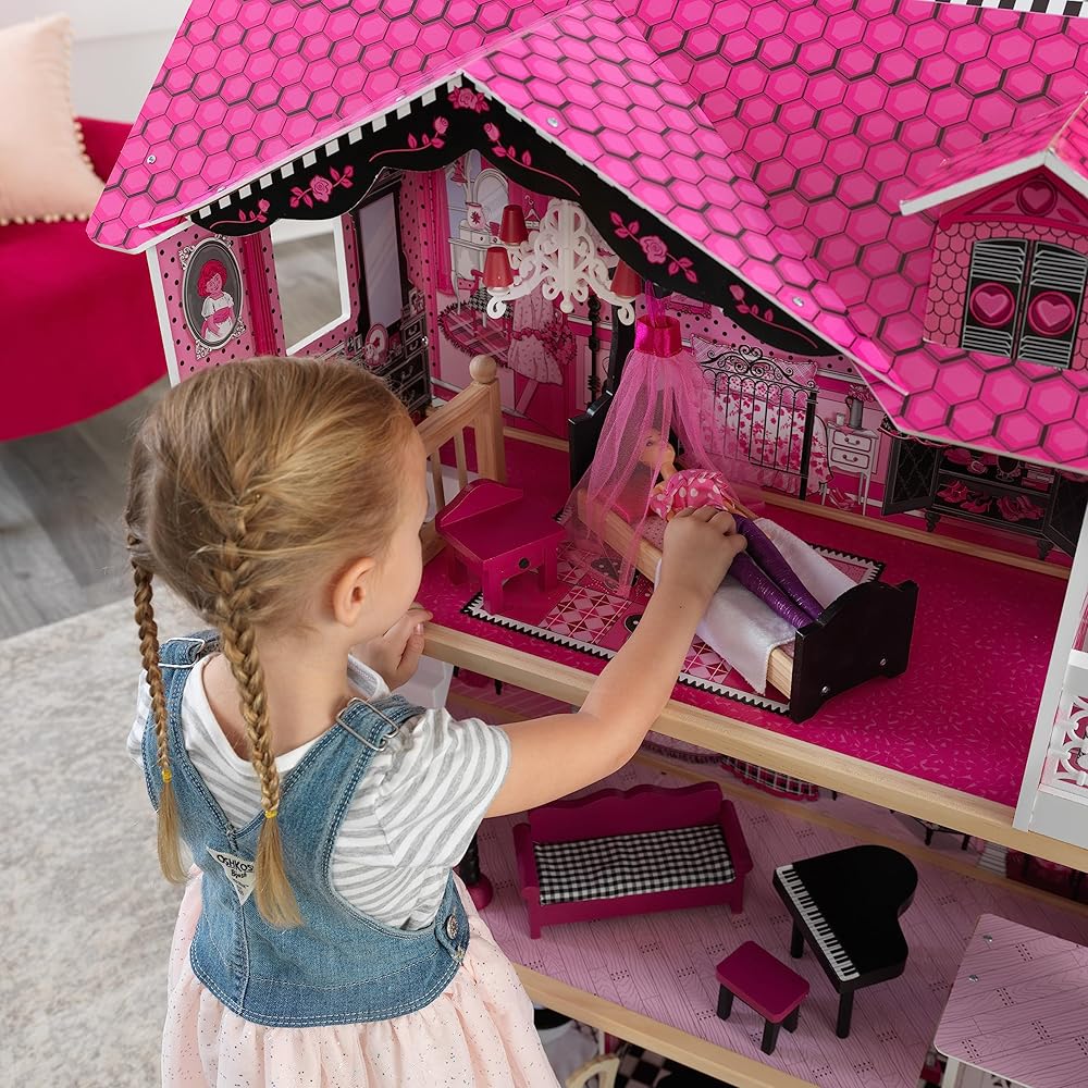 With a modern pink and black design, our KidKraft Amelia Dollhouse is a fun and stylish place to play. With three levels and standing nearly four feet tall, this dollhouse offers plenty of space for multiple children to play together. The included 15-piece accessory kit offers endless decorative possibilities for 12-inch fashion dolls.