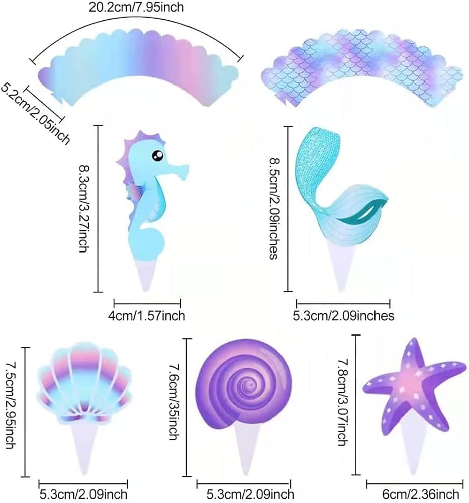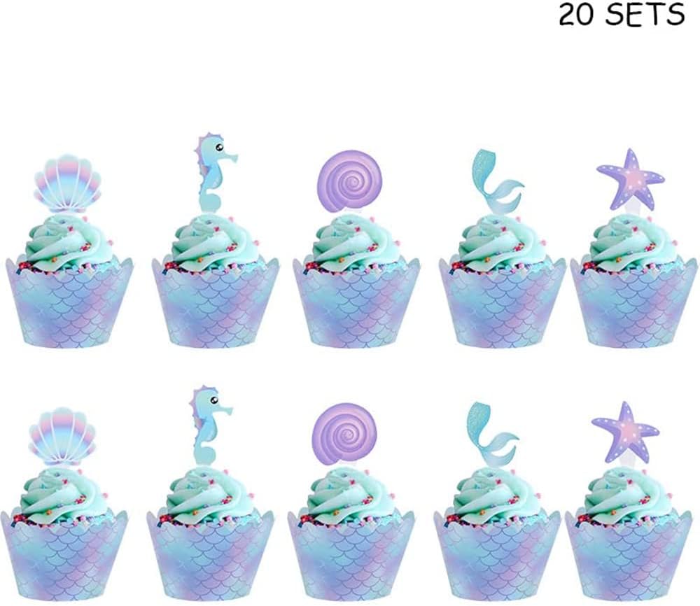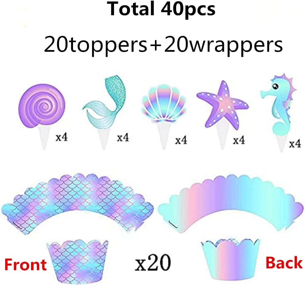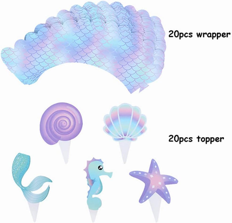 Abundant quantity: the package contains 20 pieces of mermaid cupcake wrappers and 20 pieces of mermaid cupcake decorations (5 styles, each style has 4 pieces), ample quantity and different styles can meet your diverse decorations needs.