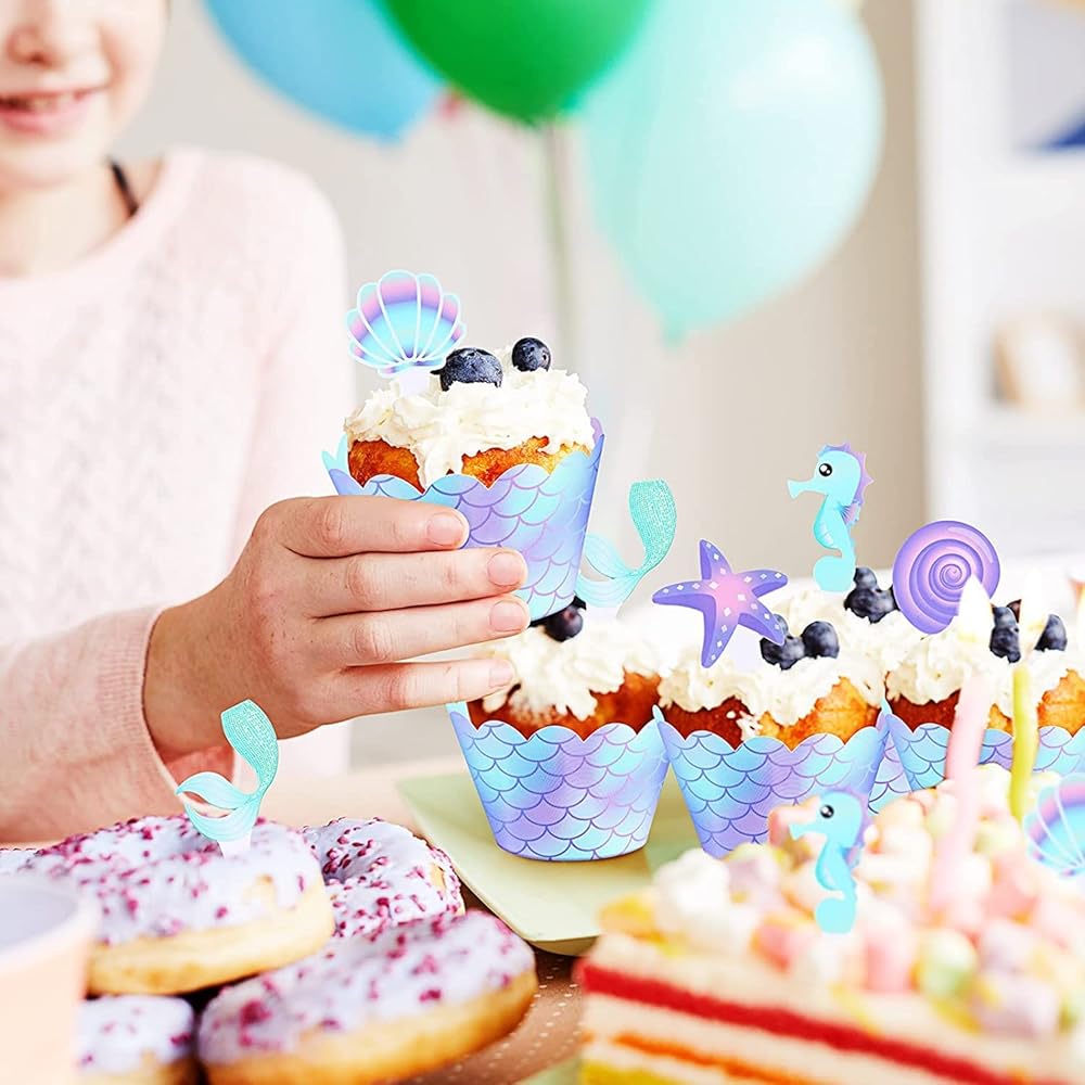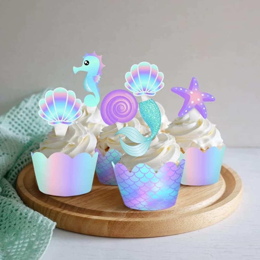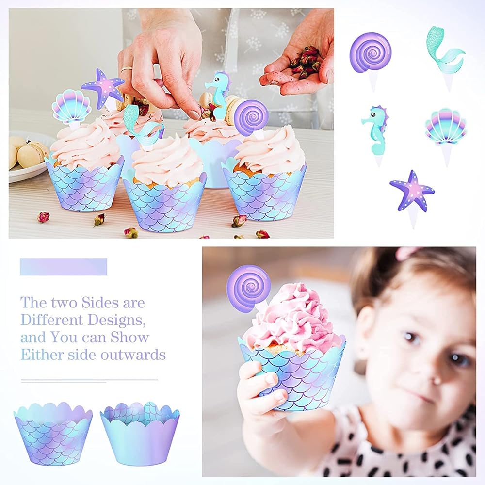 Dreamy and delicate design: the mermaid party cupcake toppers are designed in starfish, seahorse, shell, mermaid tail and conch patterns; And the mermaid cupcake liners are double-sided design that scales pattern on one side and gradients on the other, with blue and purple colors, they look delicate and dreamy, making your parties eye-catching and charming.
