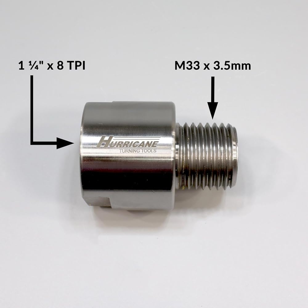 This Headstock Spindle Adapter from Hurricane Turning Tools is made for lathes with a 1 1/4" x 8 TPI spindle. This spindle adapter is ideal for when you want to convert one spindle thread to another. Converts from 1 1/4" x 8 TPI to M33 x 3.5mm.