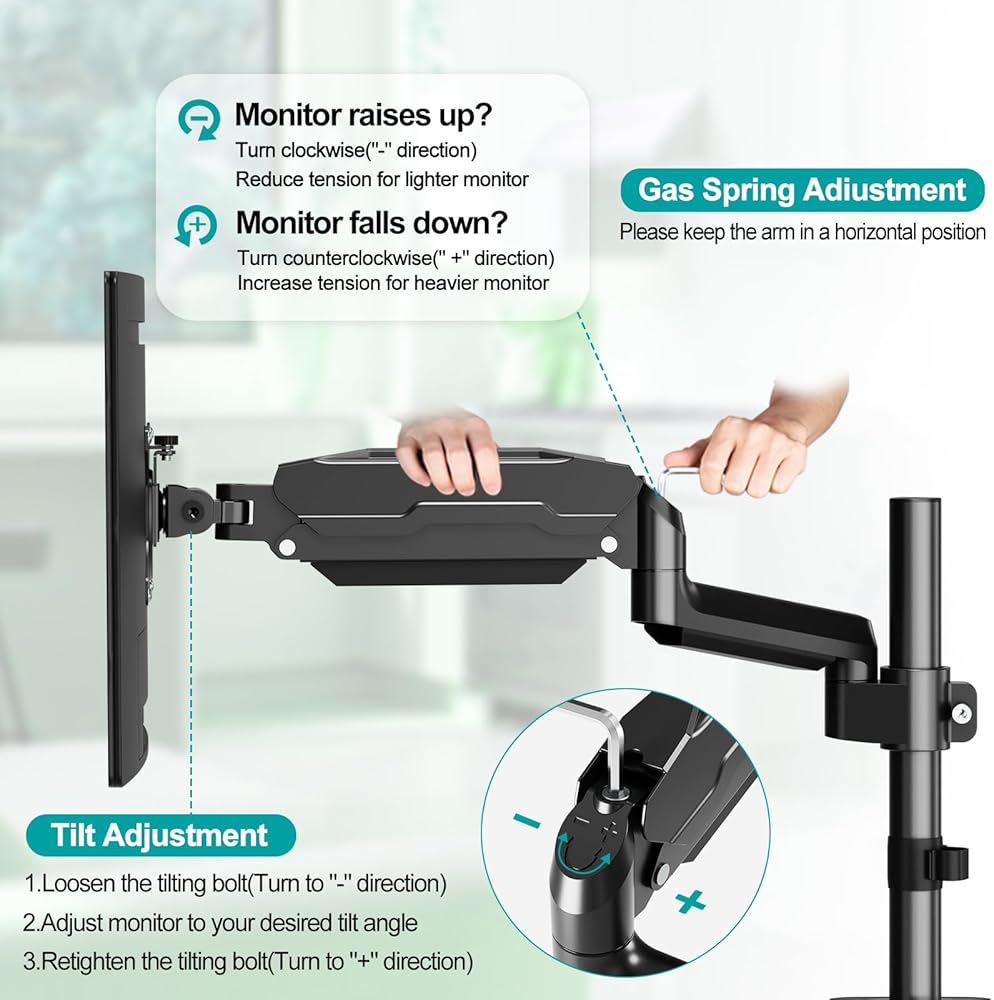 ذراع شاشة متوافقة على نطاق واسع: تم تصميم حامل الشاشة الفردي للشاشات الأكبر والأثقل. يناسب ذراع الشاشة مقاس 13-32 بوصة ويدعم الشاشات التي يبلغ وزنها 4.4-19.8 رطل، ويتوافق مع نمط VESA مقاس 75 × 75 مم أو 100 × 100 مم. حامل ذراع الشاشة الفردي الخاص بنا مناسب لأجهزة ASUS وAcer وSamsung وLG وHP وAOC وBenQ وMSI وDell وLenovo وما إلى ذلك، بما في ذلك على سبيل المثال لا الحصر شاشات 13 15 17 22 24 27 29 32 بوصة.