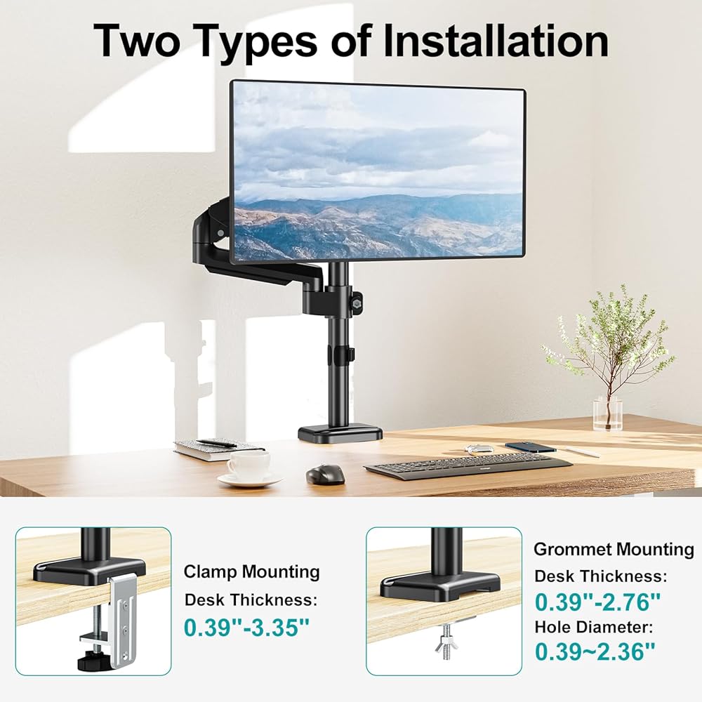سهولة التركيب: يأتي حامل الشاشة الفردي مزودًا بجميع الأجهزة الضرورية والتعليمات الواضحة. اعتمادًا على حالة المكتب، يمكنك اختيار التركيب بالمشبك أو الحلقة المعدنية. تثبيت بمشبك على شكل حرف C بسمك المكتب 0.39 بوصة - 3.35 بوصة أو اختر التثبيت بحلقة معدنية بسمك المكتب 0.39 بوصة - 2.76 بوصة (قطر الفتحة 0.39 بوصة - 2.36 بوصة). توفر لك MOUNT PRO خدمة عملاء احترافية قبل الشراء وبعده.