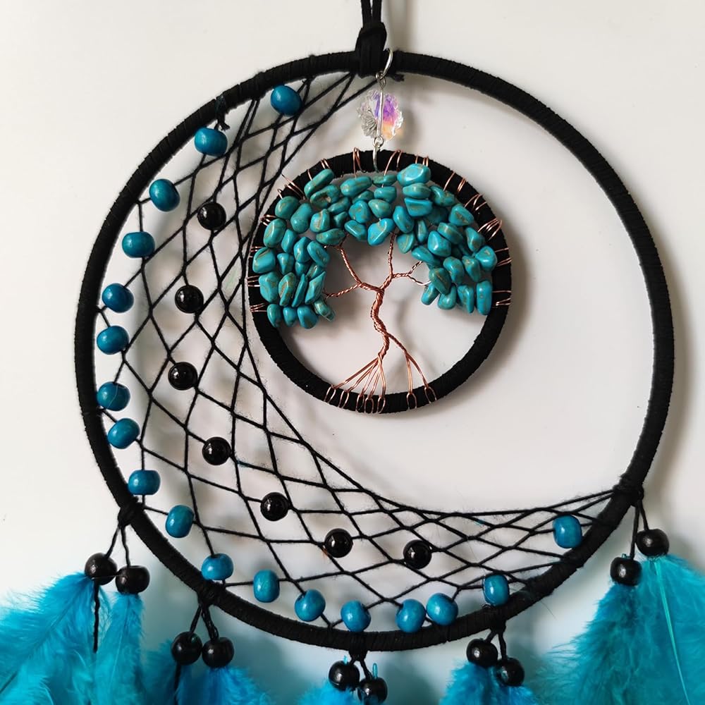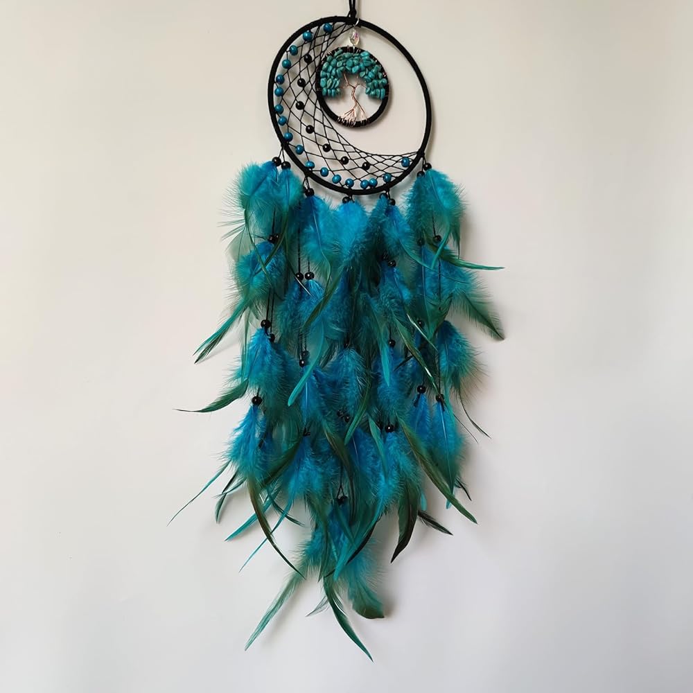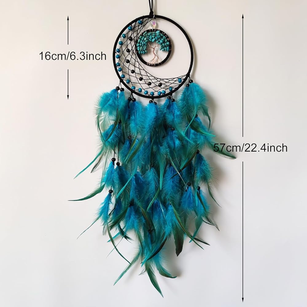 صائدة الأحلام من الريش الأزرق، صائدة أحلام شجرة الحياة لديكور غرفة النوم، صائدة الأحلام من حجر الكريستال للتعليق على الحائط، هدية مصنوعة يدويًا من الريش