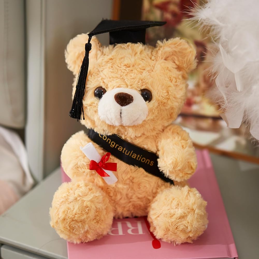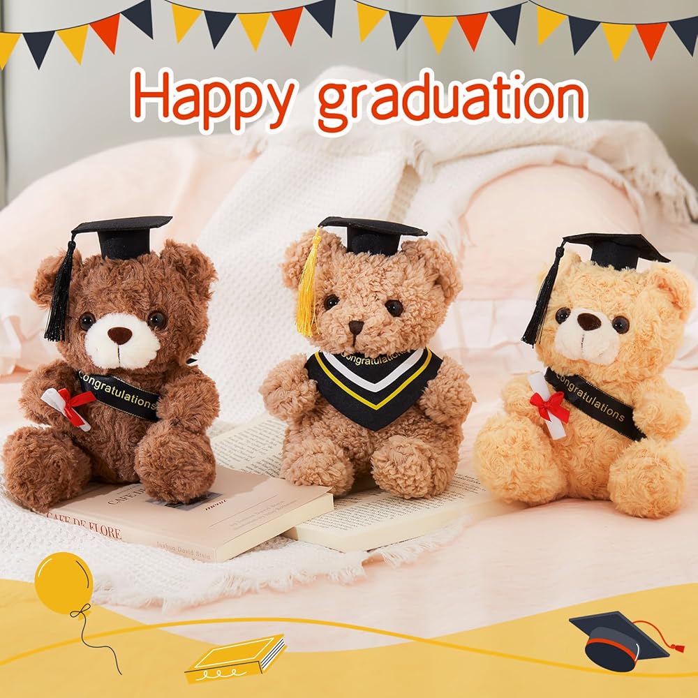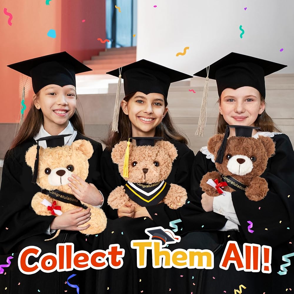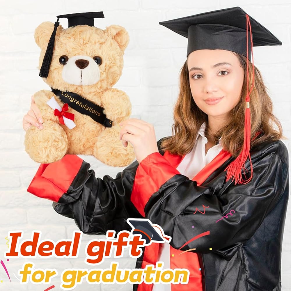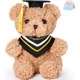 دمية دب التخرج: يرتدي هذا الدب المحشو باللون البني الرائع قبعة تخرج سوداء مع شرابات صفراء ويحمل لفافة من الشهادات، مما يجعله مثاليًا للتخرج القادم.