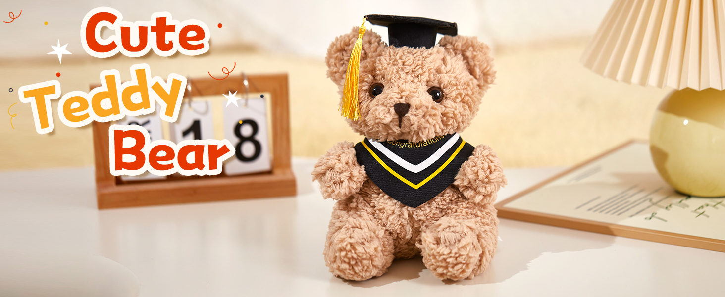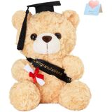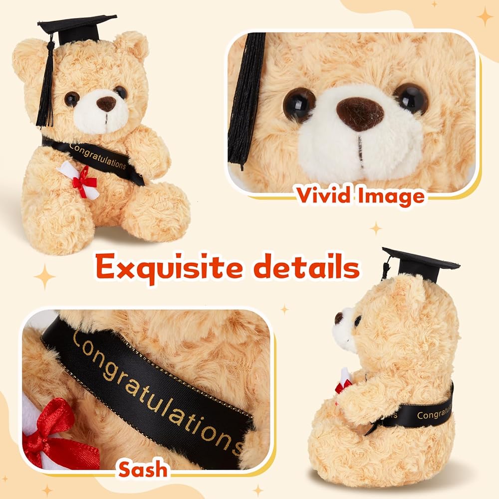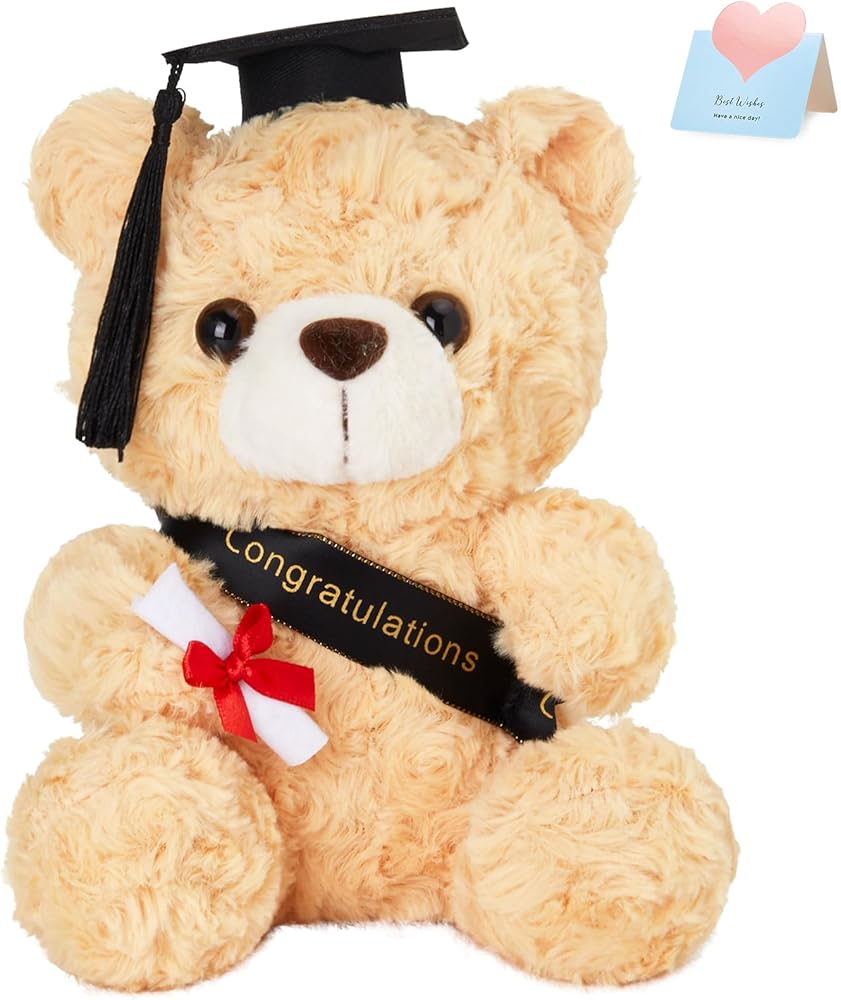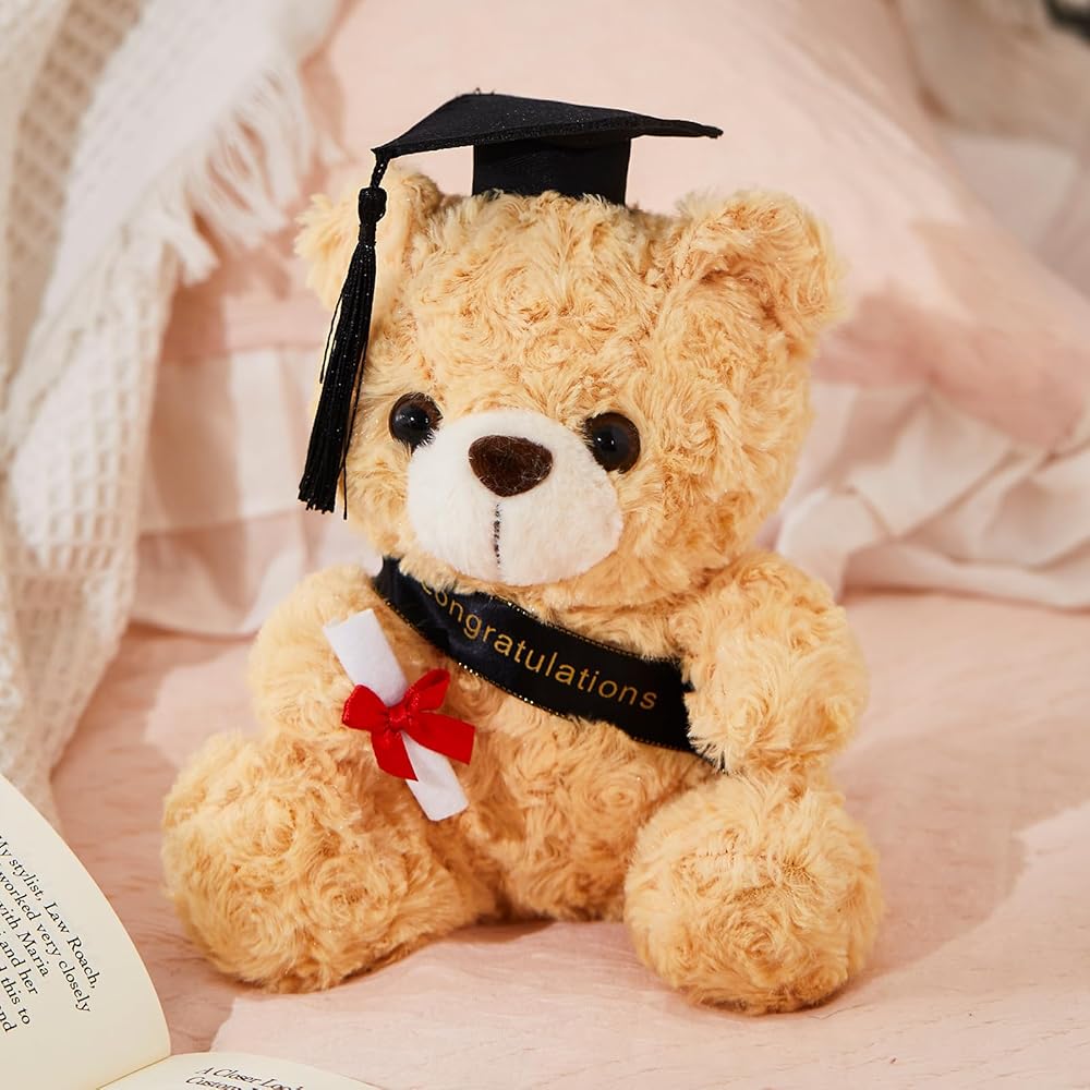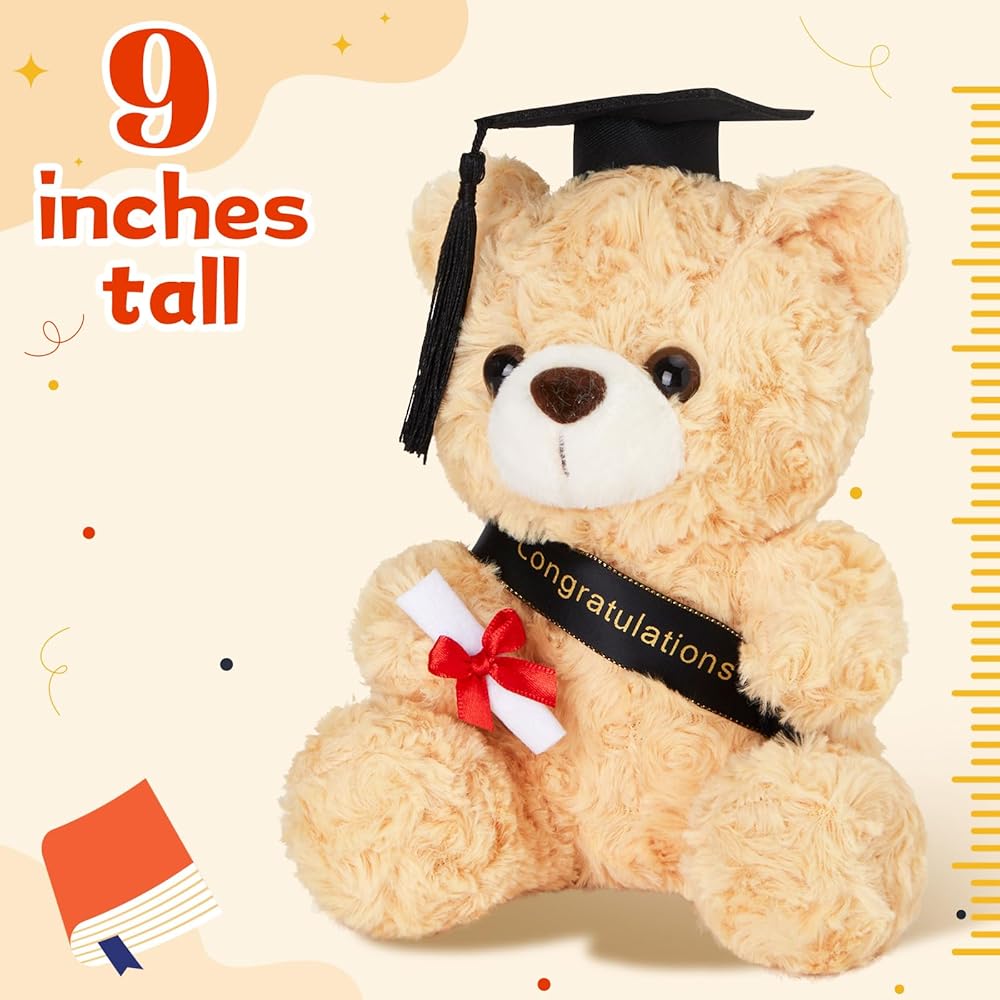 دمية دب التخرج: يرتدي هذا الدب المحشو باللون البني الرائع قبعة تخرج سوداء مع شرابات صفراء ويحمل لفافة من الشهادات، مما يجعله مثاليًا للتخرج القادم.
