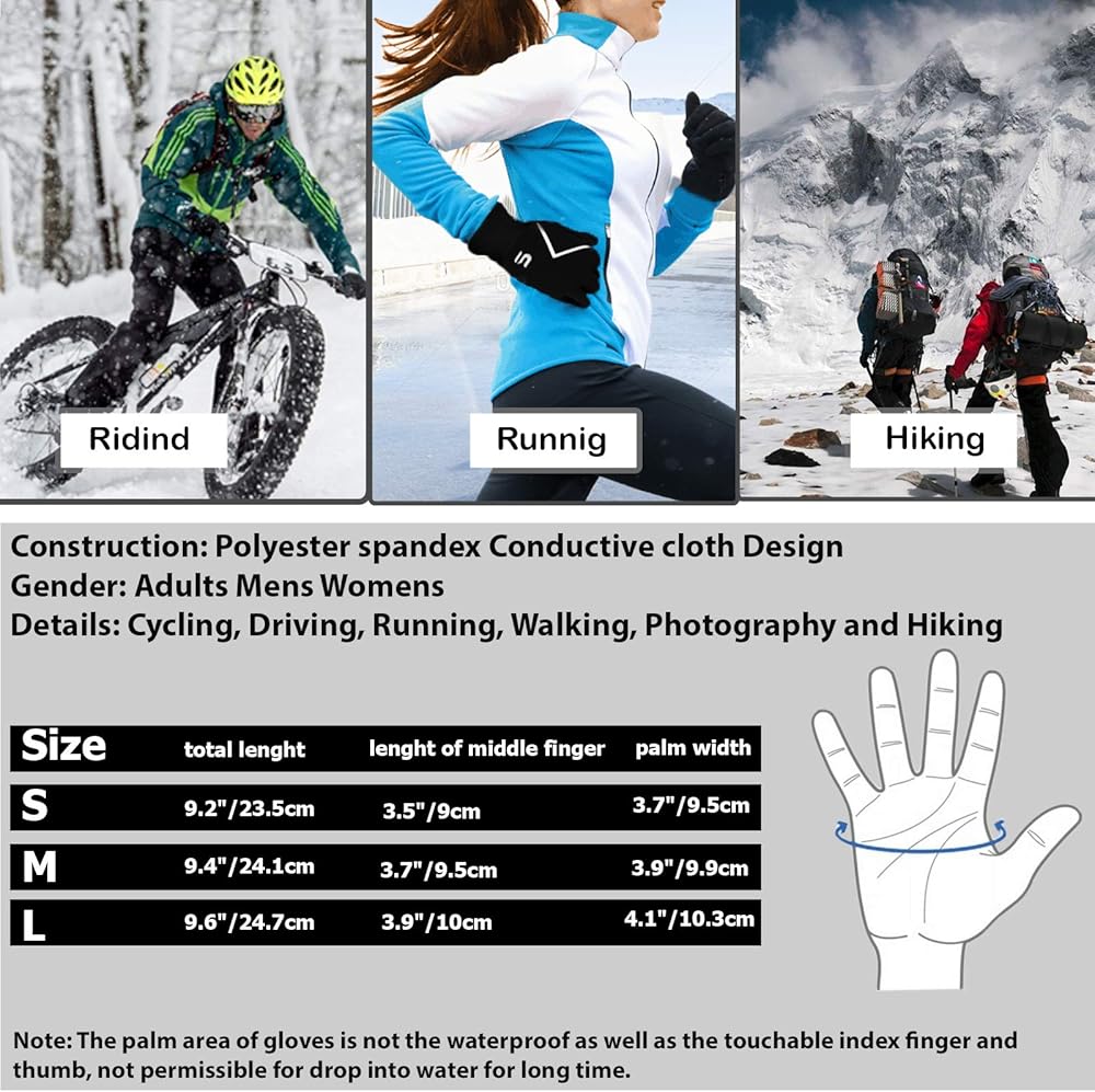 The winter cycling glove design feels warmth outdoors in winter. Enjoy your gloves when you are doing sports/riding/driving because your thumb and index finger are made of special high-quality conductive PU. Provide touch screen sensitive functions for your hands, making it easy to use your iPhone or other touch screen devices in winter. Prevent items from falling off, this glove is designed with silicone gripping on the palm, it will bring you a better user experience. Winter touch screen gloves specially designed for both autumn and winter outdoor activities.Thermal winter gloves lightweight warm three-layer fabric water-resistant and soft.