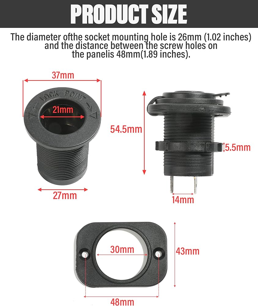 [Specification] This 12V lighter socket has a height of approximately 2.2 inches; The outer diameter is approximately 1.4 inches and the inner diameter is approximately 0.83 inches. Very suitable for your car, it requires a mounting hole size of 29 millimeters, suitable for standard size mounting panels.