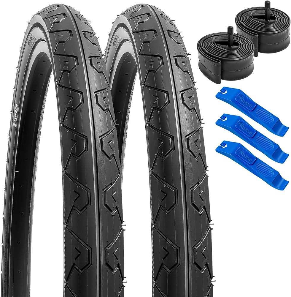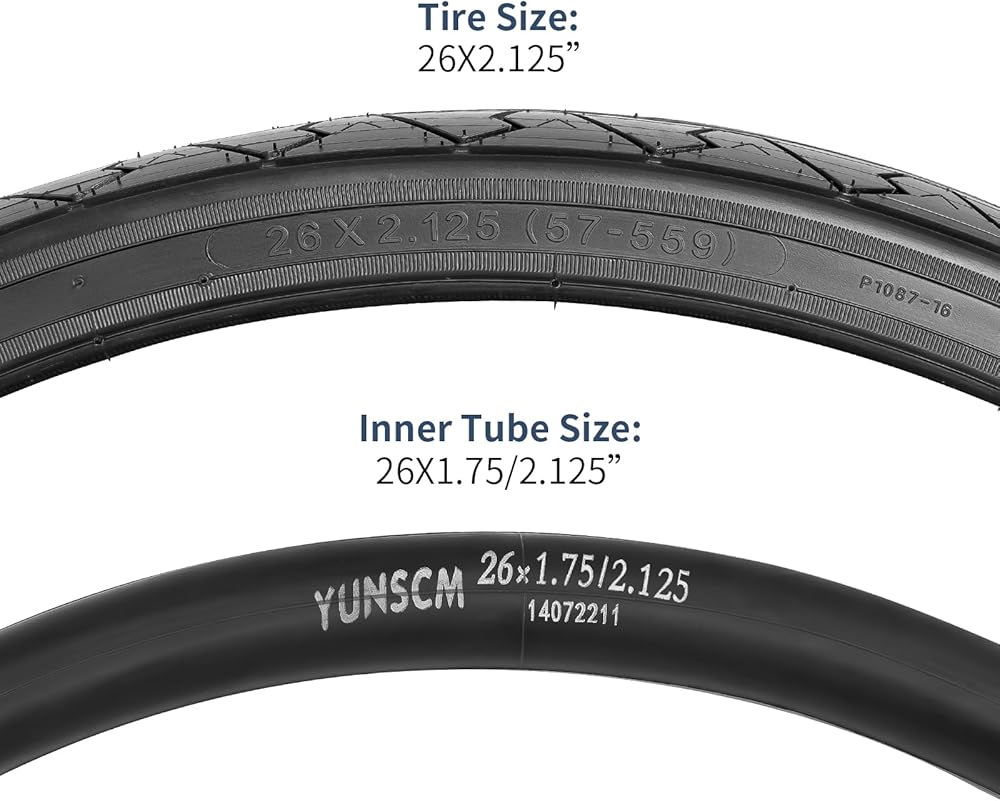 Package Includes: 26 x 2.125 bike tires (x2) , 26x1.75/2.125 AV32mm Schrader Valve bike tubes (x2), 2 rim strips.