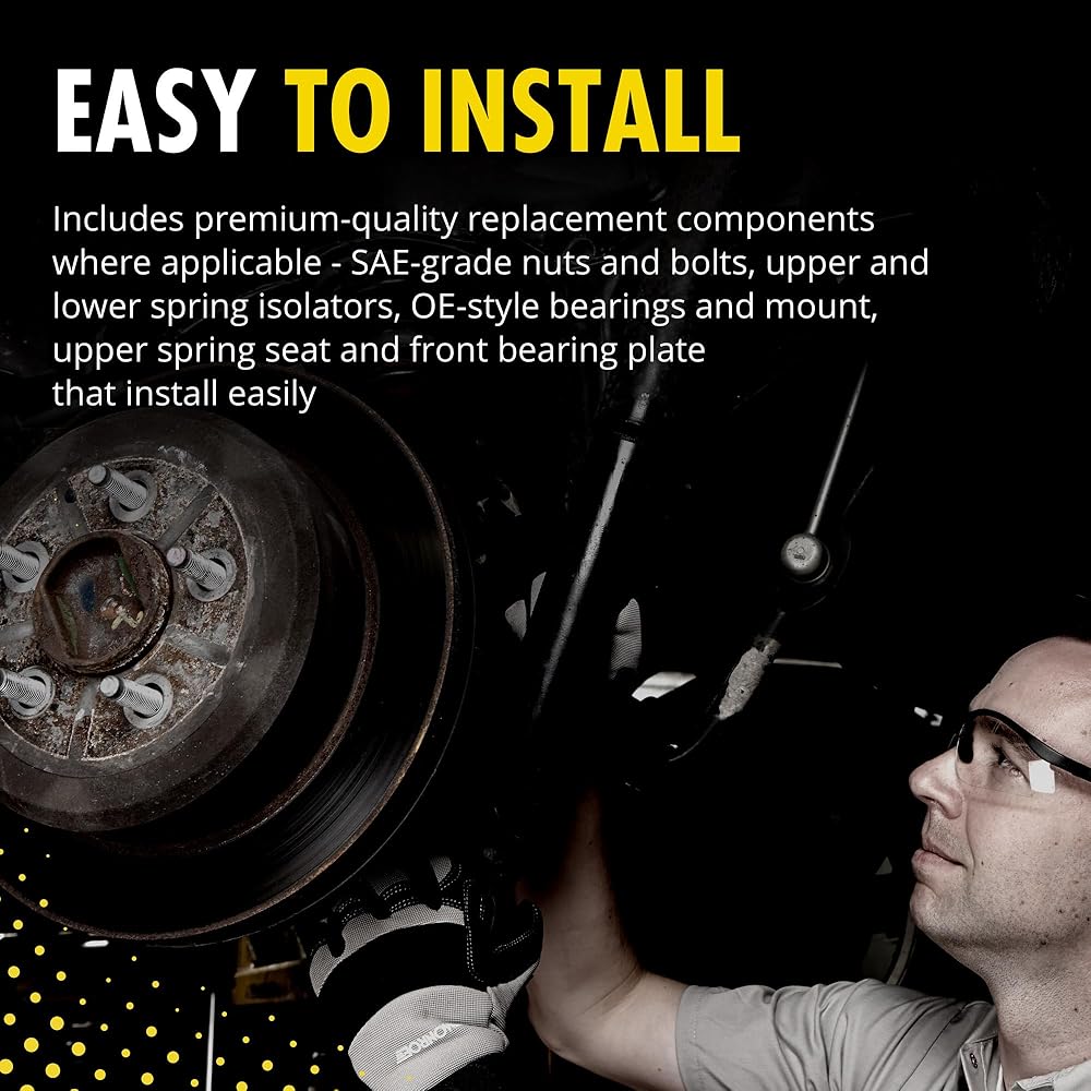 سهل التركيب - يشتمل على مكونات بديلة عالية الجودة حيثما ينطبق ذلك - صواميل ومسامير من فئة SAE، وعوازل زنبركية علوية وسفلية، ومحامل وتركيب على طراز OE، ومقعد زنبركي علوي ولوحة تحمل أمامية يمكن تركيبها بسهولة
