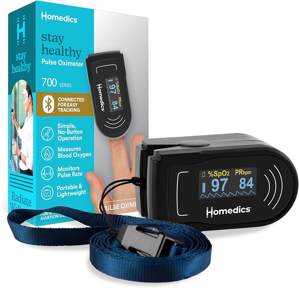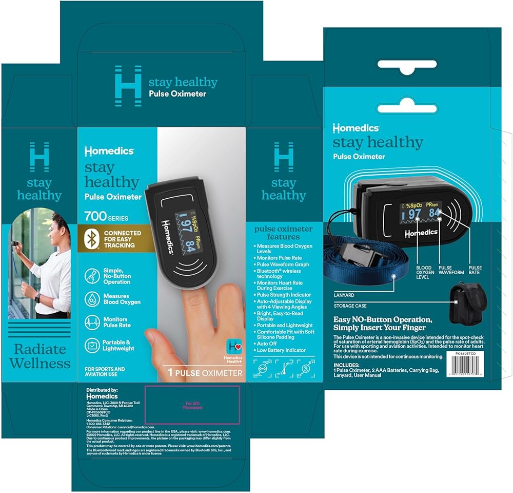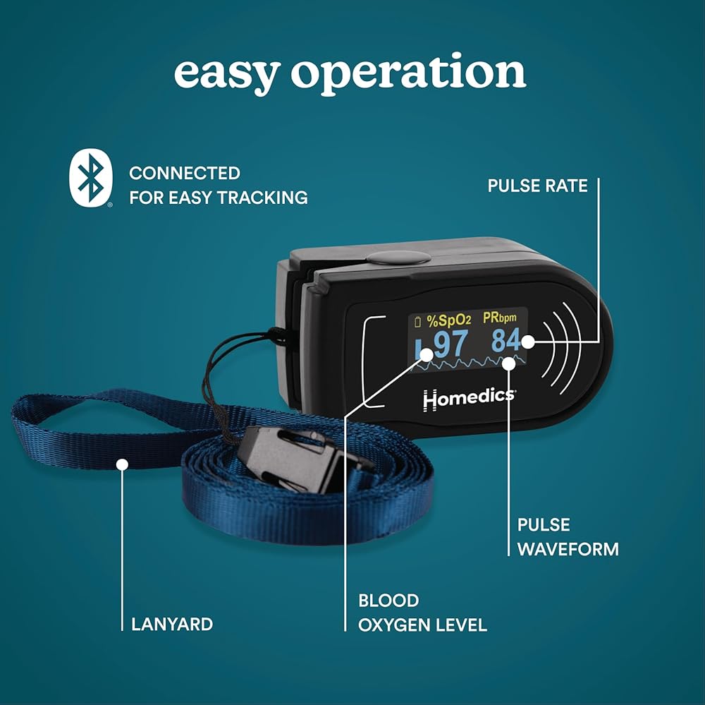 حافظ على نبض صحتك - تحقق بشكل مريح ودقيق من مستوى تشبع الأكسجين في الدم وراقب معدل نبضك باستخدام مقياس التأكسج النبضي من HoMedics. يضمن مؤشر قوة النبض وشاشة عرض الشكل الموجي PR قراءات دقيقة وموثوقة.