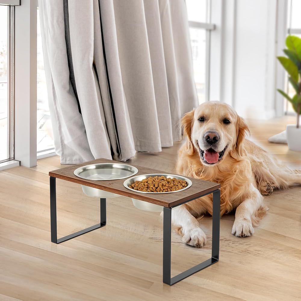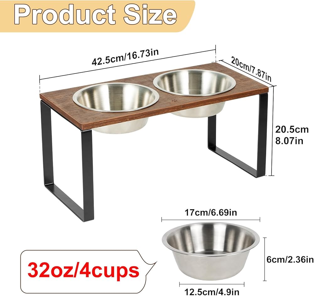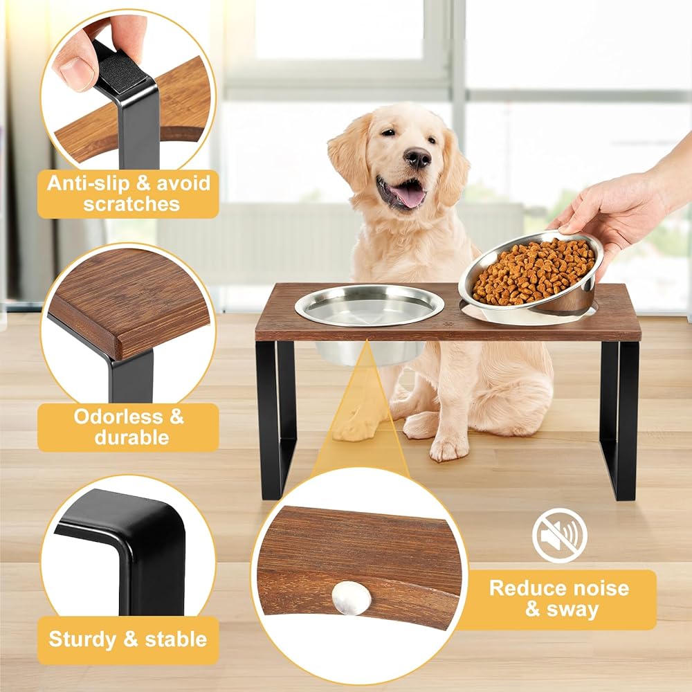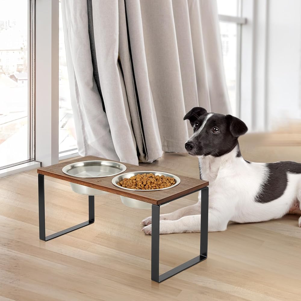 أوعية الكلاب المرتفعة من Sunhoo، وحدة تغذية مرتفعة للكلاب، حامل طويل القامة، محطة تغذية الحيوانات الأليفة الخشبية، 2 طبق من الفولاذ المقاوم للصدأ، معدن 16.73 * 7.87 * 8.07 بوصة، 32 أونصة غير قابلة للانزلاق شديدة التحمل