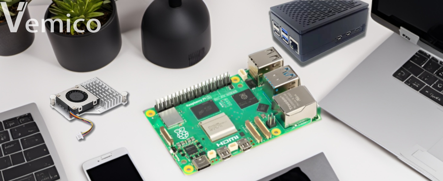 تشتمل مجموعة Vemico Raspberry Pi 5 على: 1x Pi 5 8GB Board، 1x Case ABS مع Lite V5 Active Cooler، 1x 27W USB C Power Supply، 1x 64GB Card مع قارئ بطاقات، 2x 4K Micro HDMI Cables.